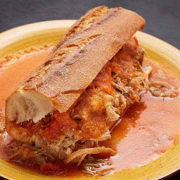 Media Torta ahogada de carnitas acompañada con salsas cebolla y rábanos completa.