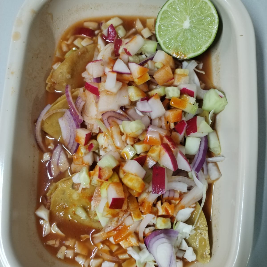 Torta ahogada de carnitas acompañada con salsas cebolla y rábanos completa.