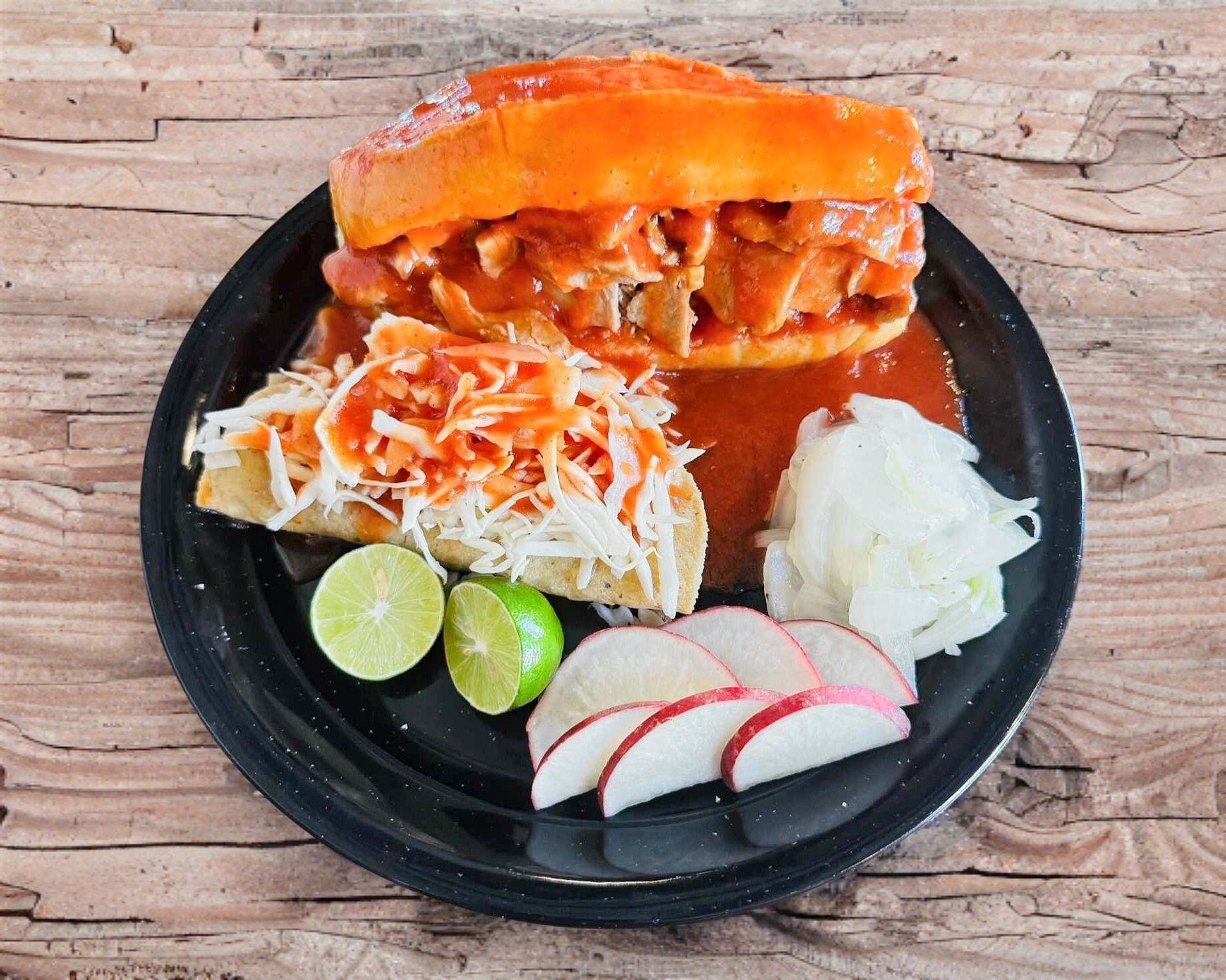 Deliciosa torta de pancita, con frijoles, salsa y cebolla con picante