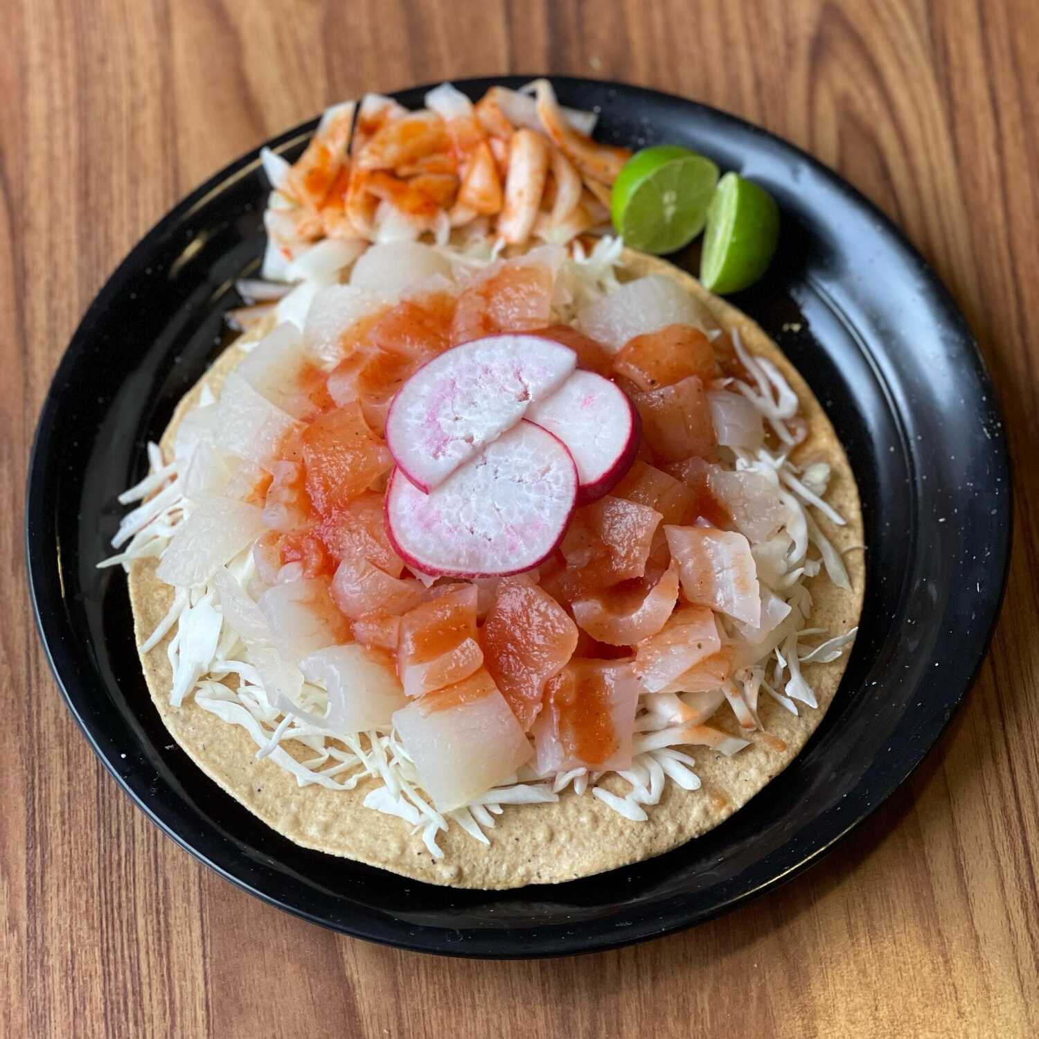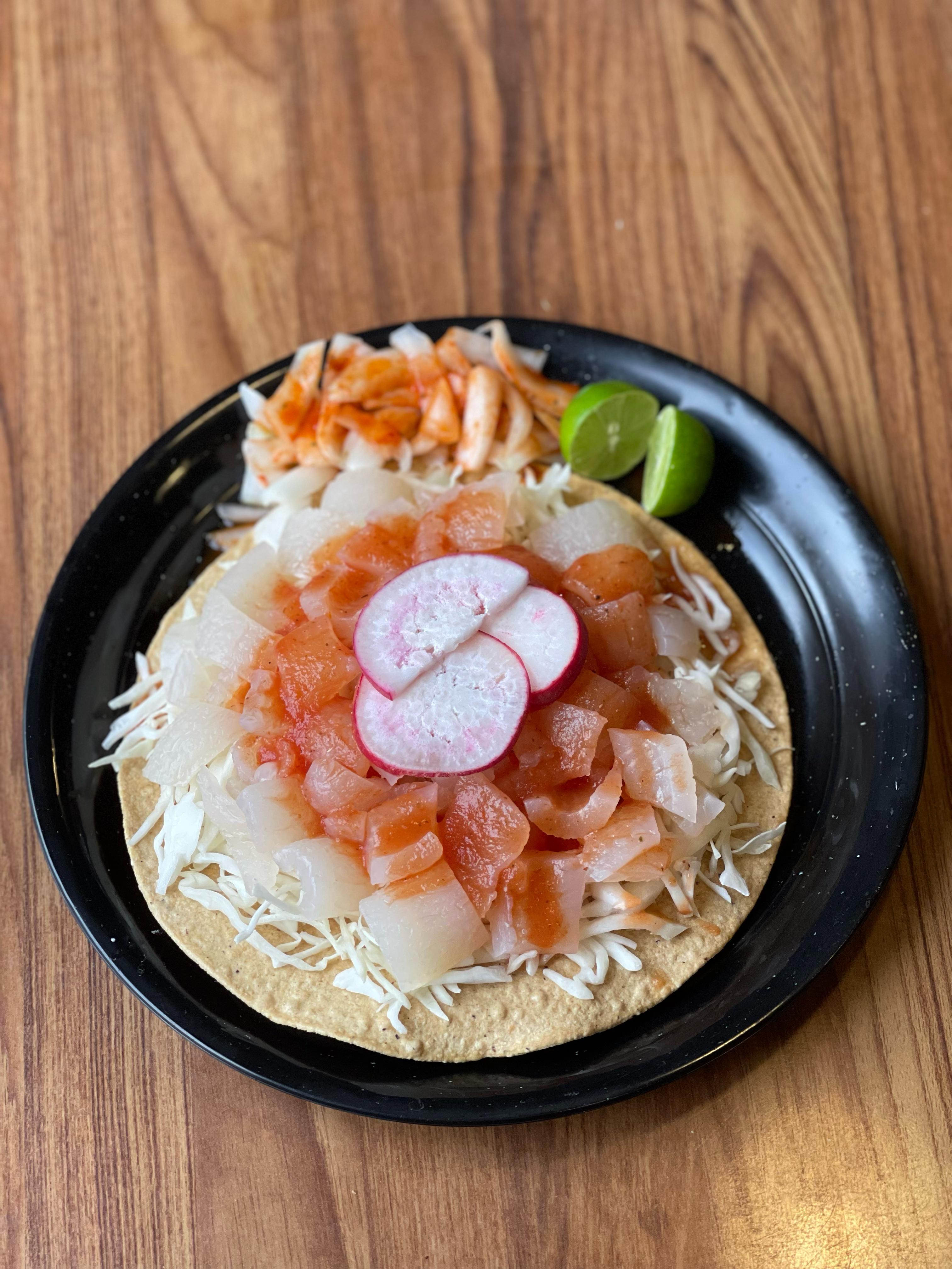 Tostada con aguacate, camarón, verdura, salsa especial y pepino con habanero
