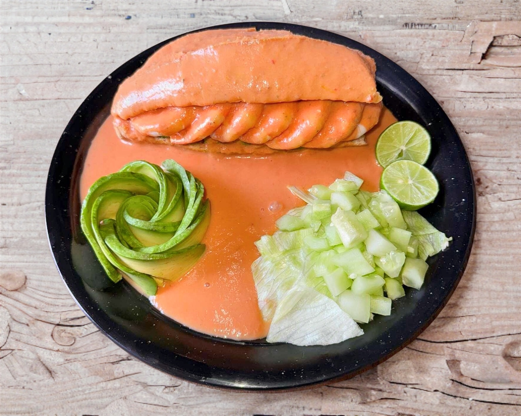 Deliciosa torta de Camarón, con aguacate, salsa especial y pepino con habanero