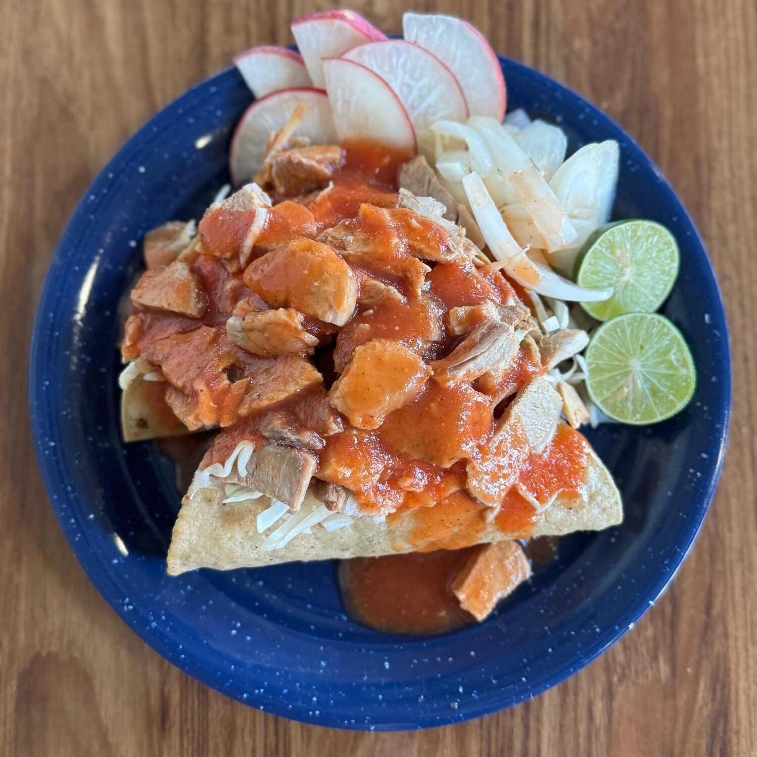 Tostada con frijoles, pollo, verdura, salsa y cebolla con picante
