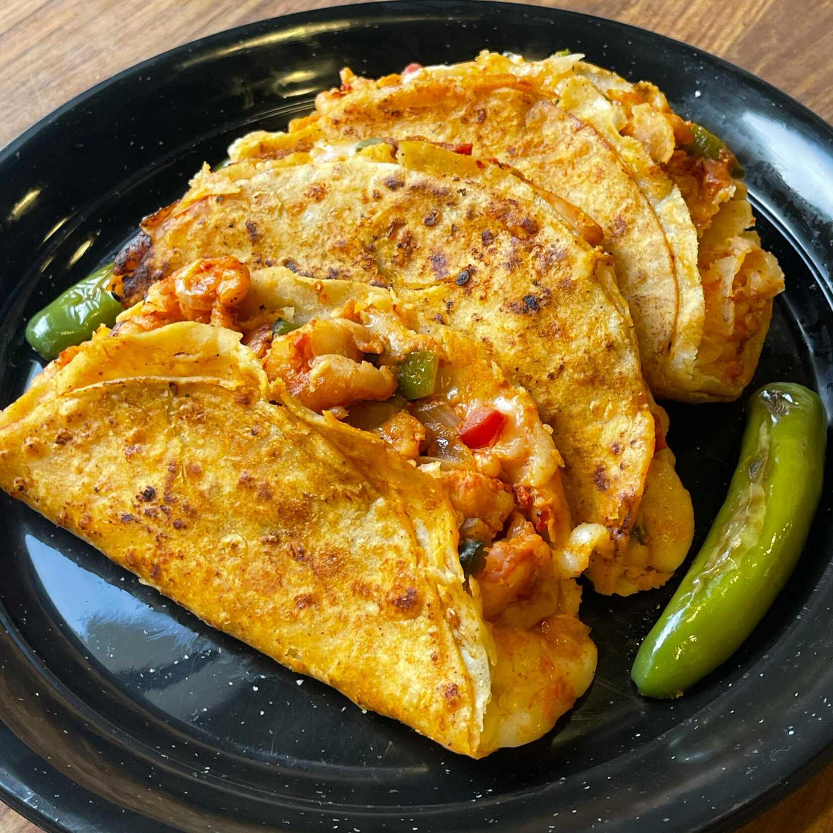 El taco consentido de la casa, taco adobado blandito con queso gratinado y camarón preparado y acompañado de chile asado