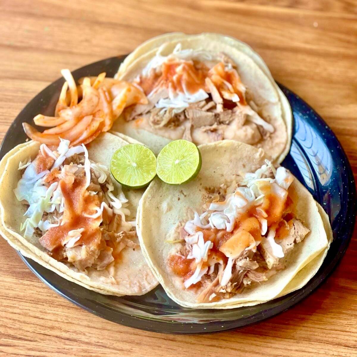 tacos blanditos calientitos con frijoles, panela, verdura, salsa y cebolla con picante
