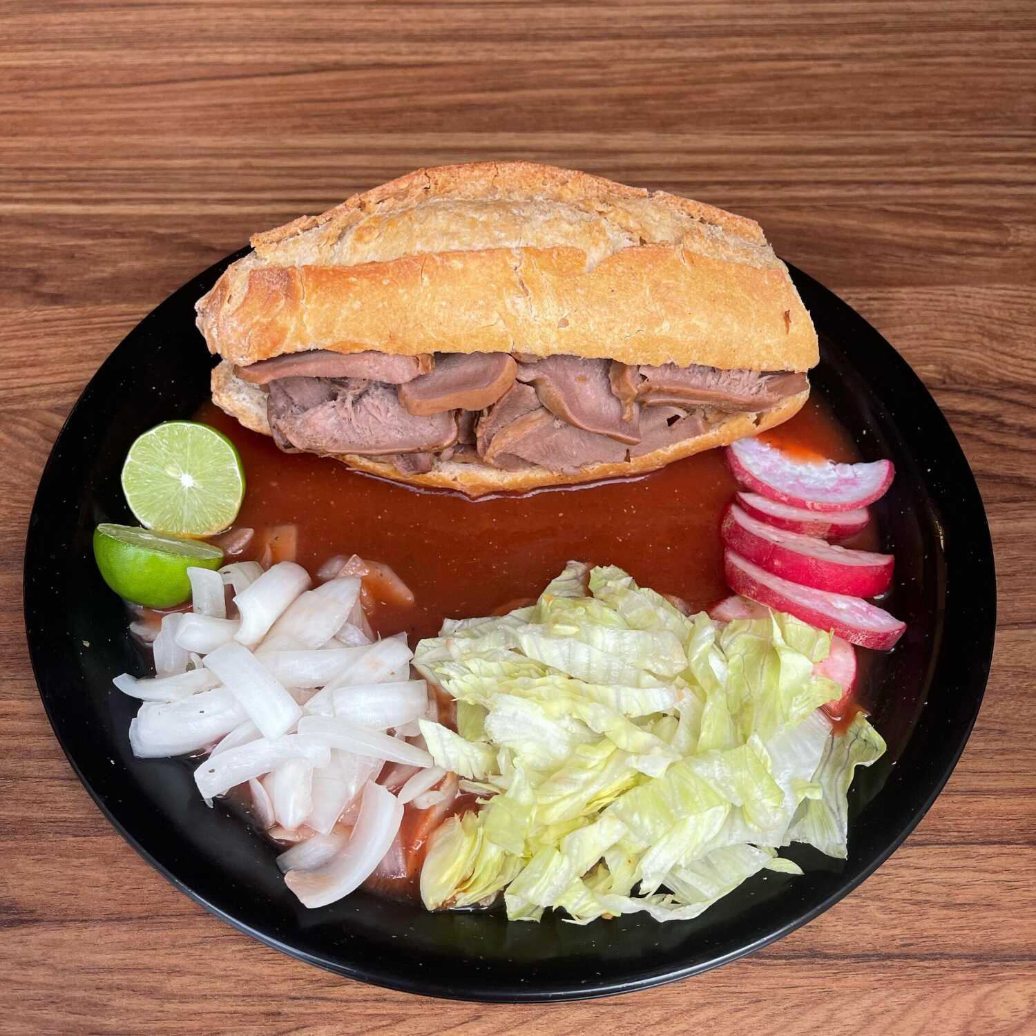 Deliciosa torta de carnitas, con frijoles, salsa y cebolla con picante