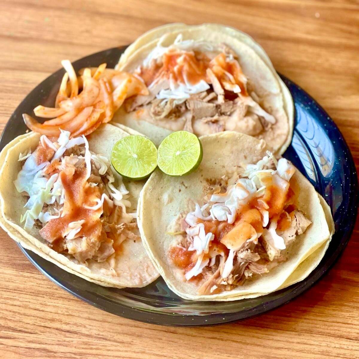 tacos blanditos calientitos con frijoles, carne, verdura, salsa y cebolla con picante