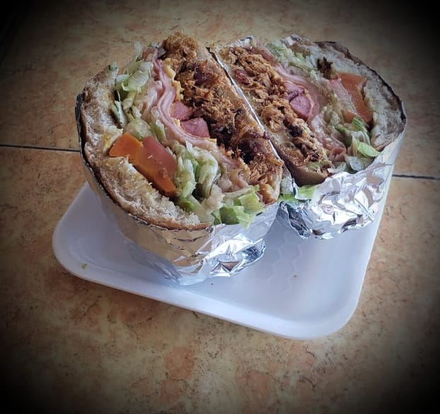 Tortilla de harina, jamon, queso, lechugs, jitomate, chile, catsup.