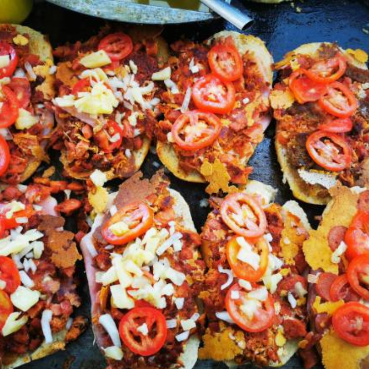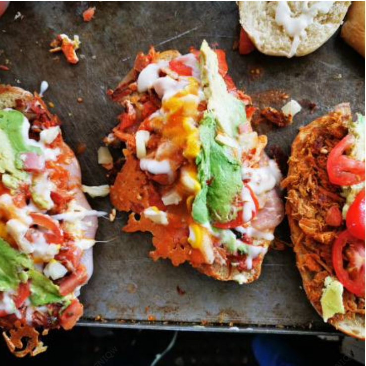 Queso blanco, piña, aguacate, cebolla y jitomate con crema, salsa especial y mostaza, aparte se acompañan con chiles en almíbar y salsa de chipotle.