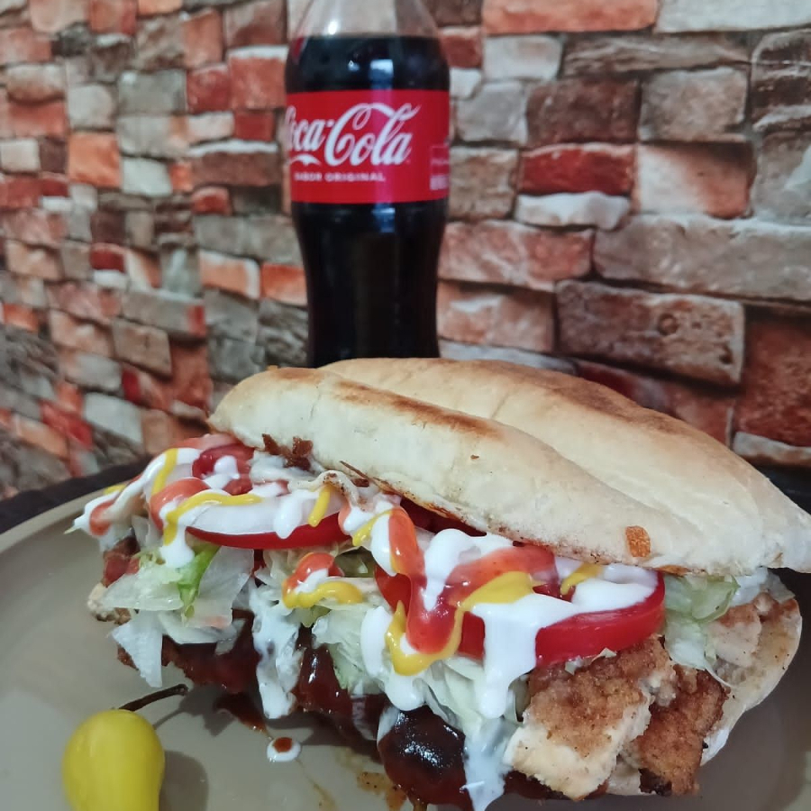 Telera, milanesa de pollo, 3quesos, salsa bbq, lechuga, jitomate, cebolla, mostaza, crema y catsup.