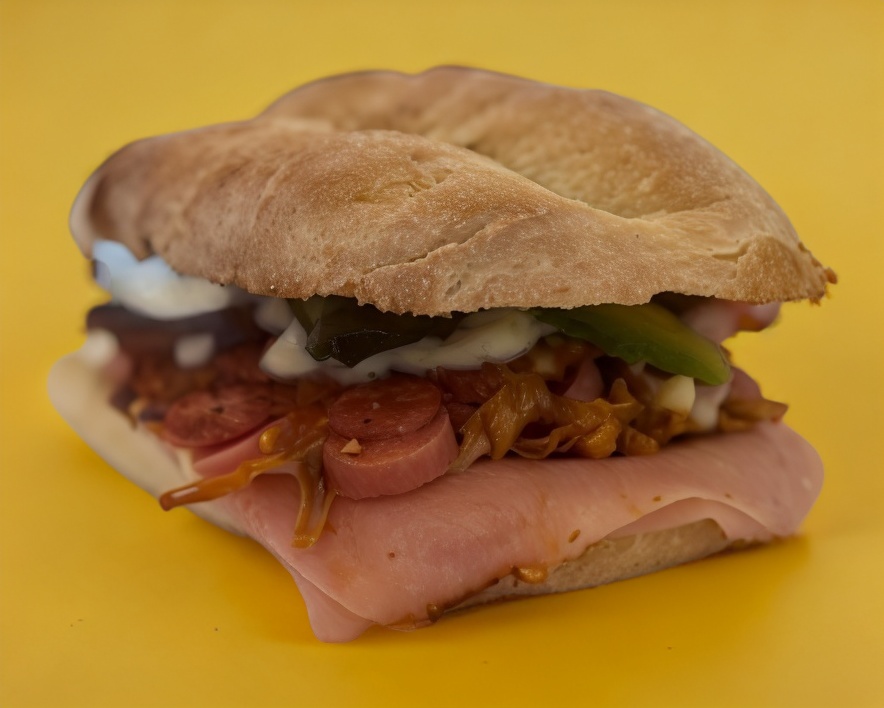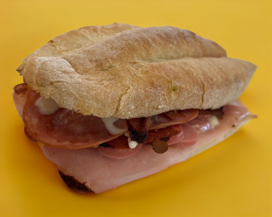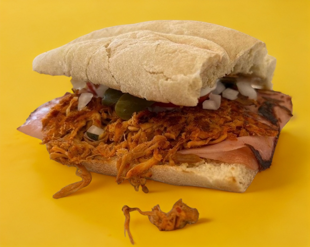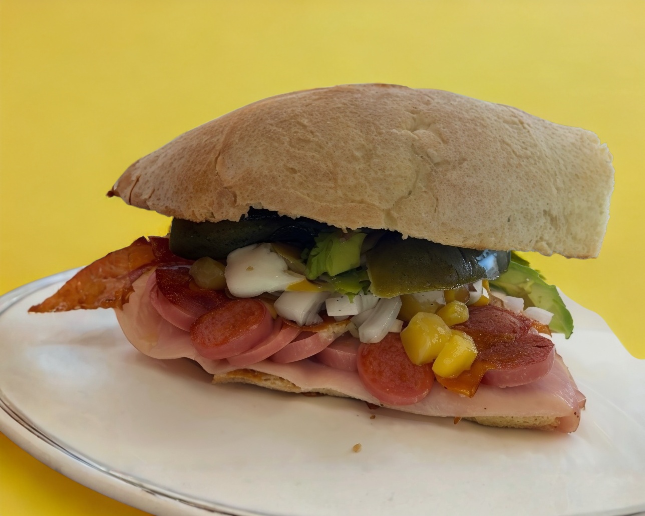 Telera, salami, salchicha, jamón, queso blanco, queso amarillo, jitomate, cebolla, aguacate, crema, mostaza, jalapeño