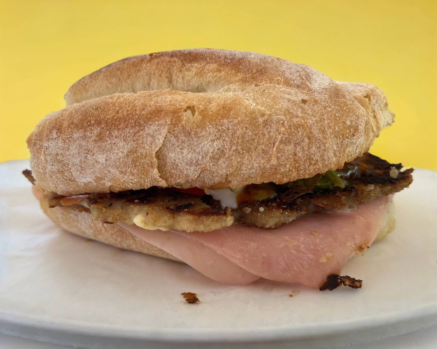 Telera, milanesa, jamón, queso blanco, queso amarillo, jitomate, cebolla, aguacate, crema, mostaza, jalapeño