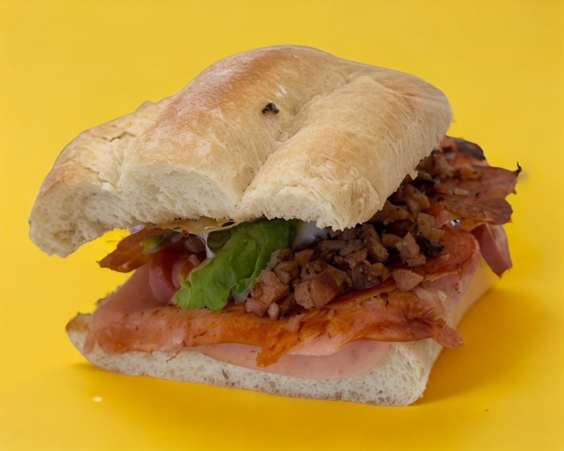 (Personal)Telera, tocino, salchicha, jamón, queso blanco, queso amarillo, jitomate, cebolla, aguacate, crema, mostaza, jalapeño