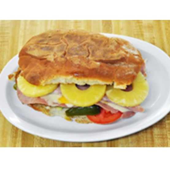 Nuestra Torta Hawaiana es un viaje de sabores: Un suave pan artesanal relleno de Jamón, trozos de piña caramelizada, suculento tocino y queso manchego derretido.