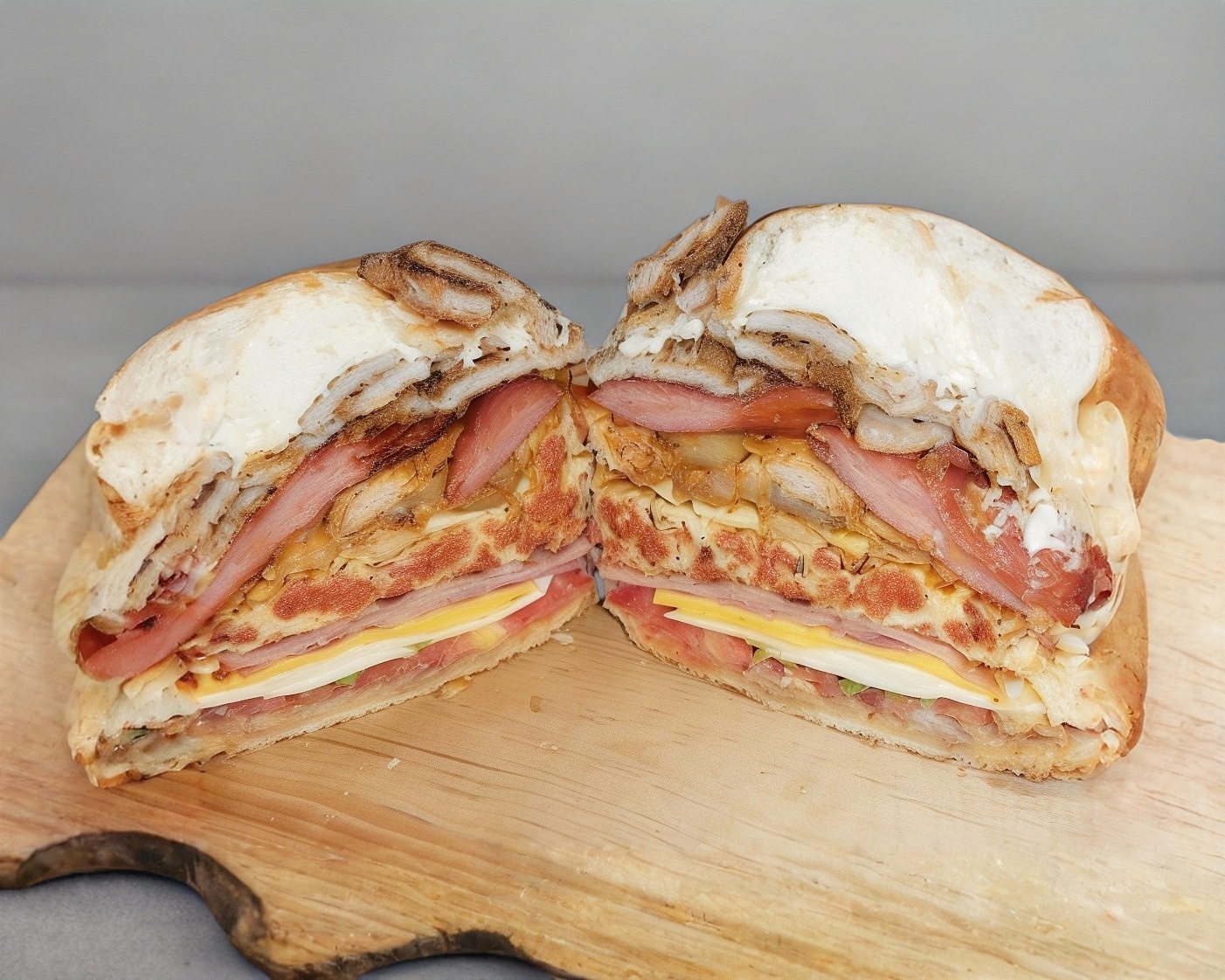 Jamón, queso Oaxaca, piña, jitomate, cebolla, aguacate, frijol, mayonesa, jalapeño