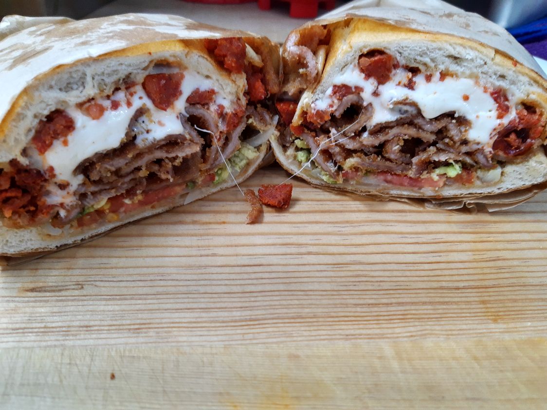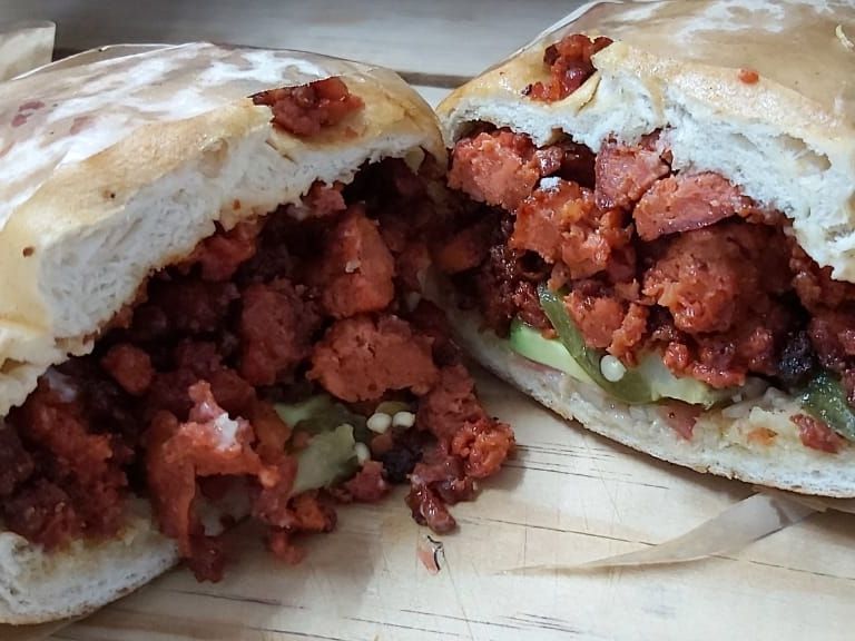 Milanesa, chorizo, queso Oaxaca, jitomate, cebolla, aguacate, frijol, mayonesa, jalapeño