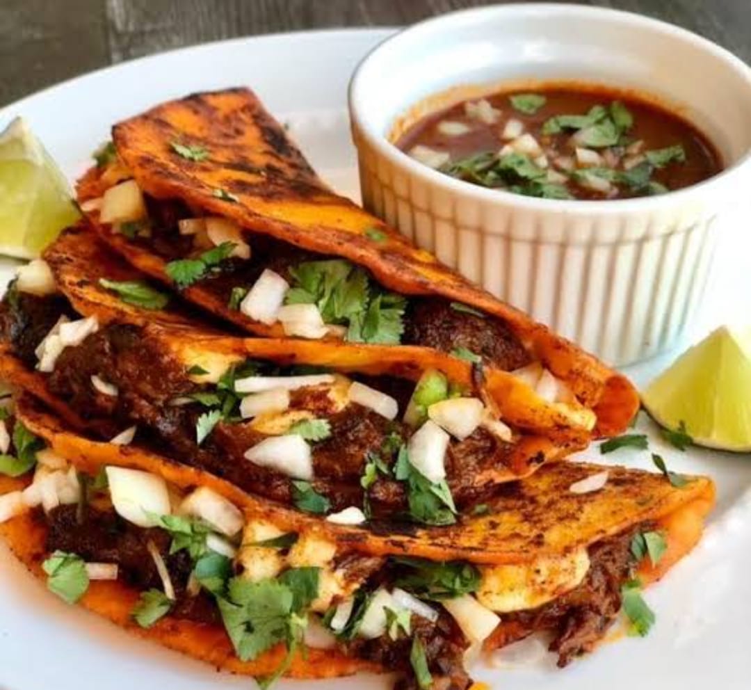 Tacos con birria, con queso fundido, cebolla, salsa y cilantro.