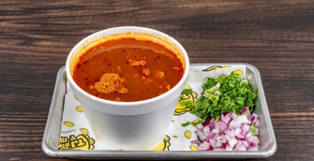 1/2 litro de birria de res con carne y fideos , incluye salsas cebolla , cilantro limones y 4 tortillas