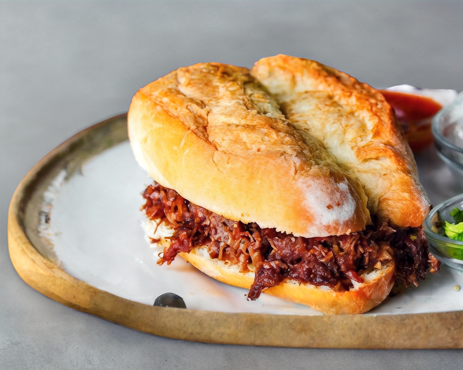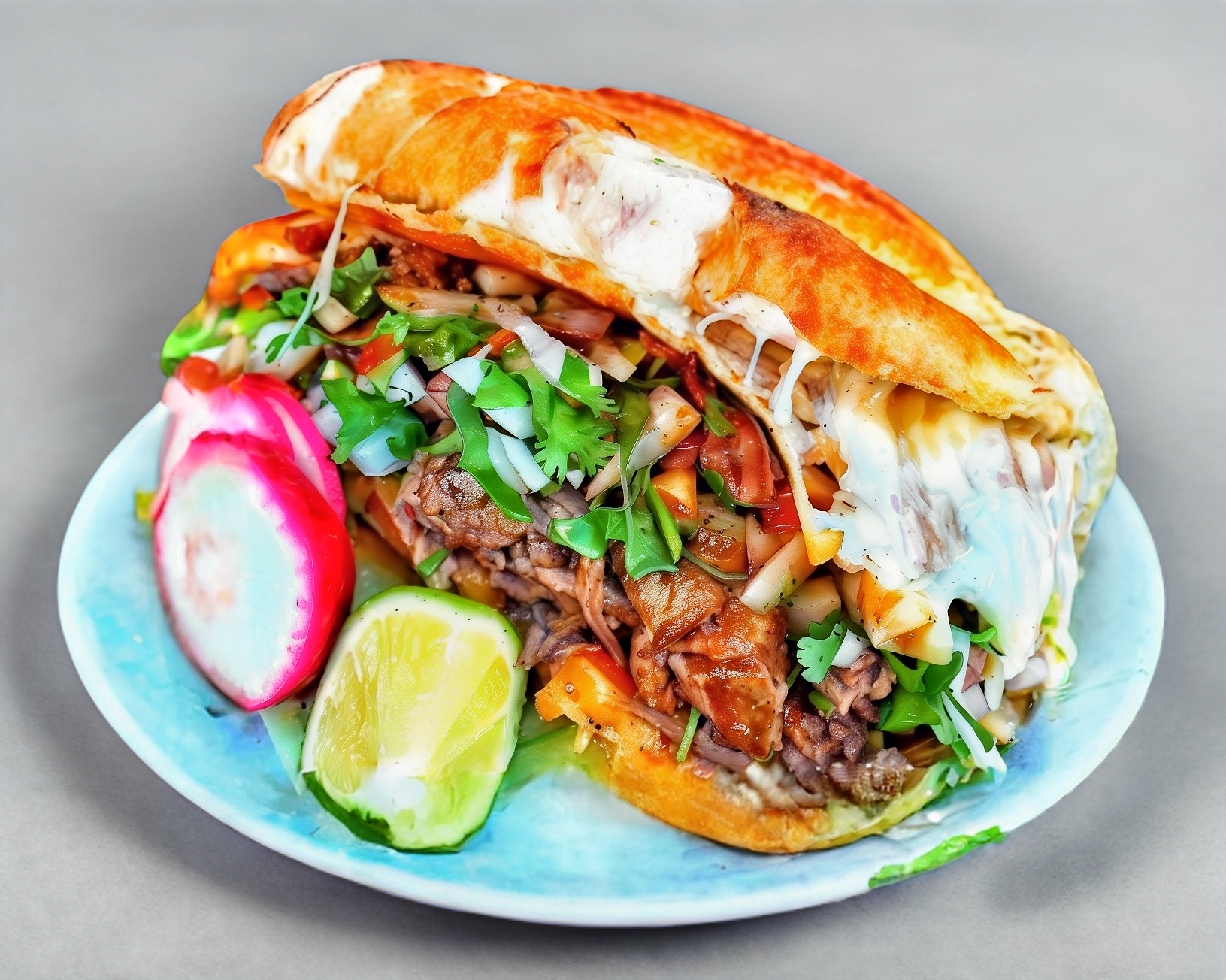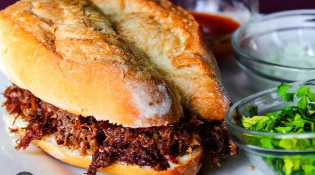 El tradicional lonche de birria y queso con salsas y cebolla.