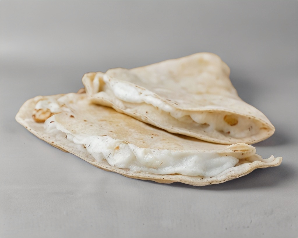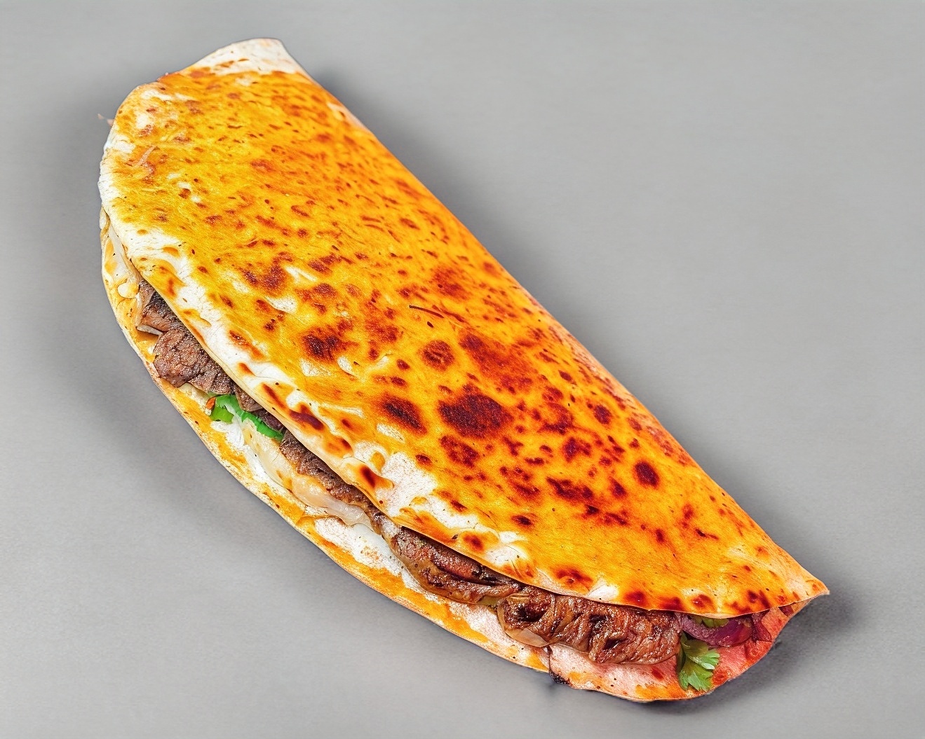 Tortilla de harina de aproximadamente 30 cm con birria, queso fundido, cebolla y salsas.