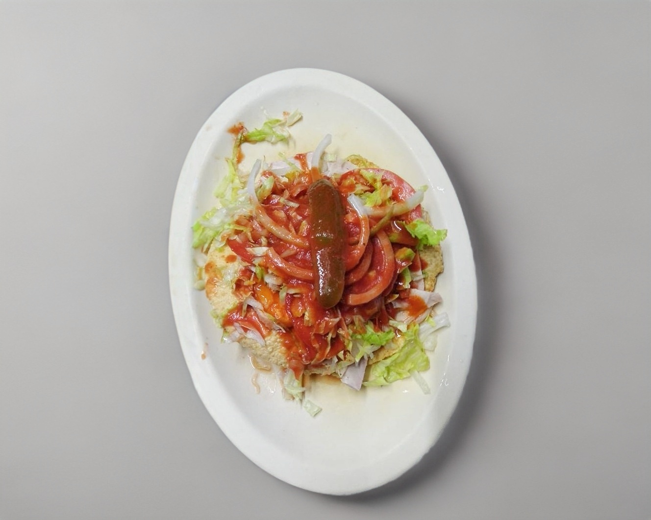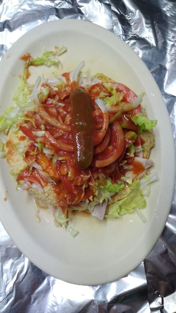 Jitomate, cebolla, lechuga, salsa y picante por separado.