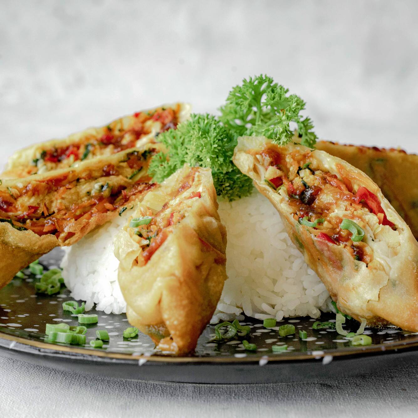 Empanadas fritas rellenas de verduras con salsa agridulce ligeramente picante, acompañadas de gohan.