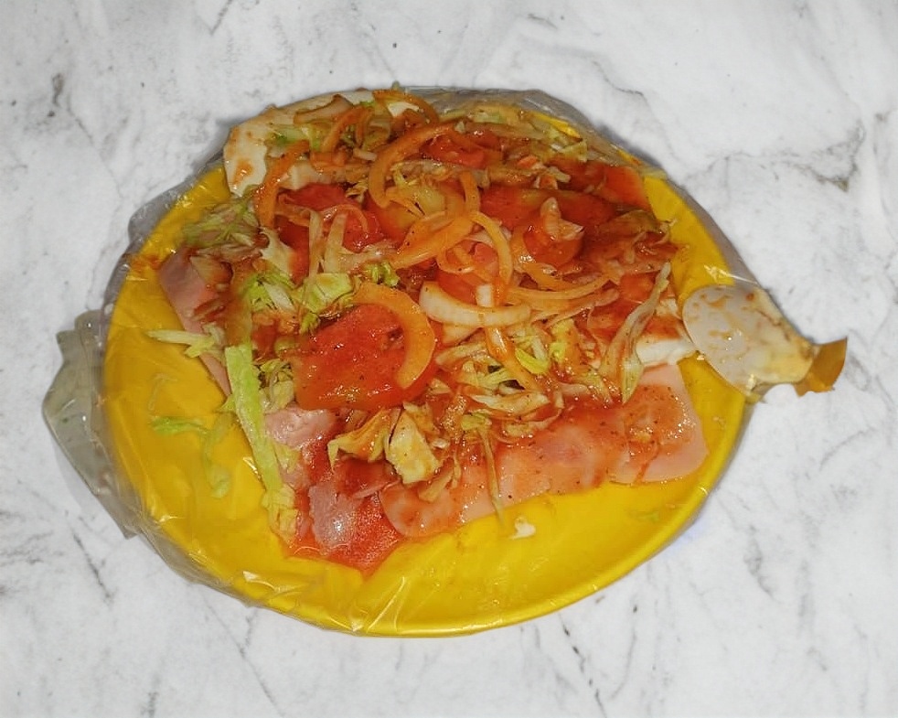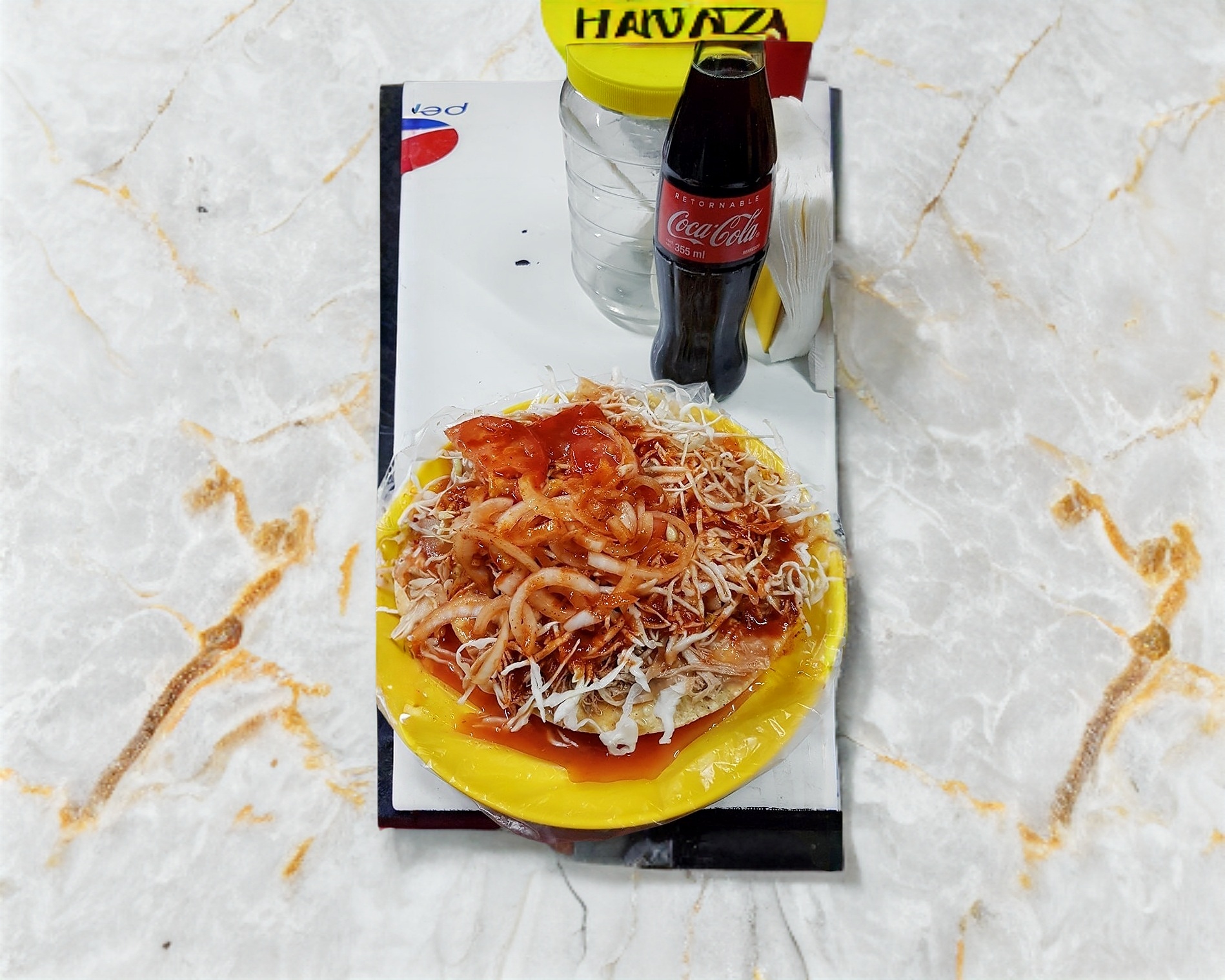 Tostada a bade de harina de maiz de Pierna (100 gramos )Lechuga o col jitomate salsa cebolla.