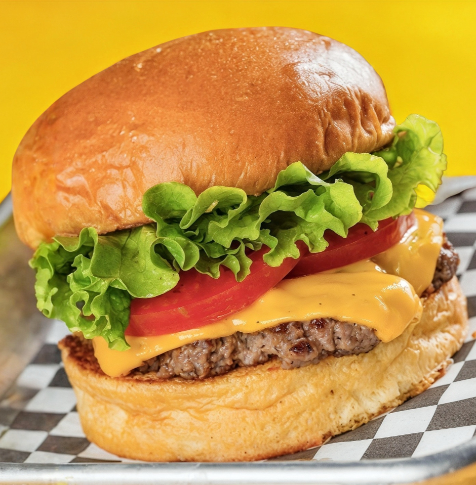 Hamburguesa 100% carne de res selecta, Pan Brioche artesanal, aderezo de la casa, lechuga, jitomate y queso americano
