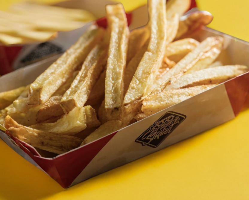 Papas fritas cortadas a mano, con un toque de sal y tocino.
