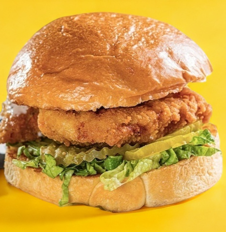 Hamburguesa con Pechuga de pollo natural, empanizado al momento, pan Brioche artesanal, aderezo ranch, pepinillos y lechuga