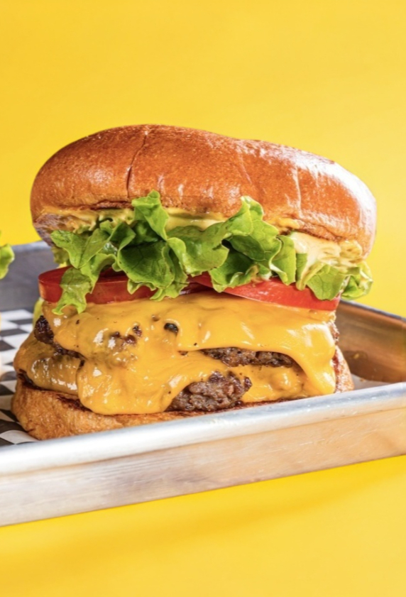 Hamburguesa doble Carne 100% carne de res selecta, Pan Brioche artesanal, aderezo de la casa, lechuga, jitomate y queso americano