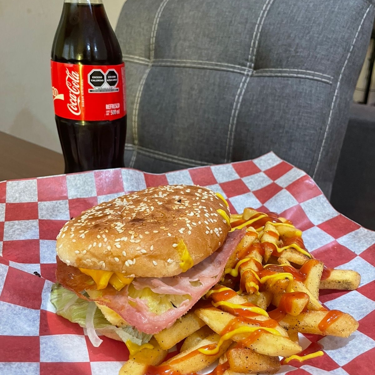 Deliciosa hamburguesa de res 100% con mayonesa jitomate, cebolla, lechuga, pepinillos, jalapeños, queso americano, catsup, mostaza, acompañada de papas a la francesa + Coca Cola 500ml.