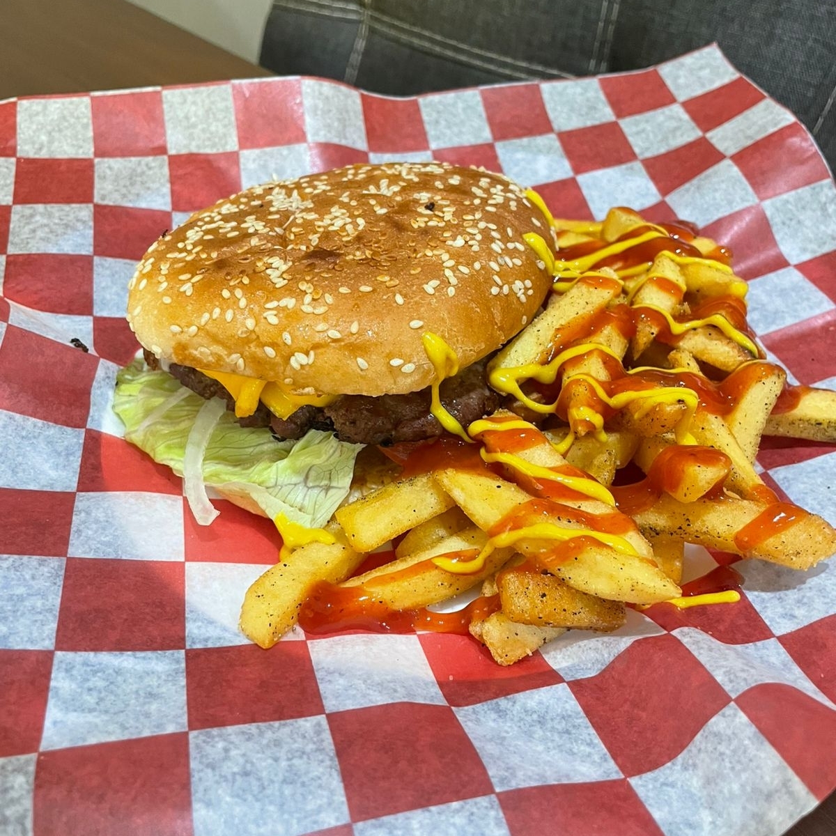 Deliciosa hamburguesa de res 100% con mayonesa jitomate, cebolla, lechuga, pepinillos, jalapeños, queso americano, catsup, mostaza, acompañada de papas a la francesa.