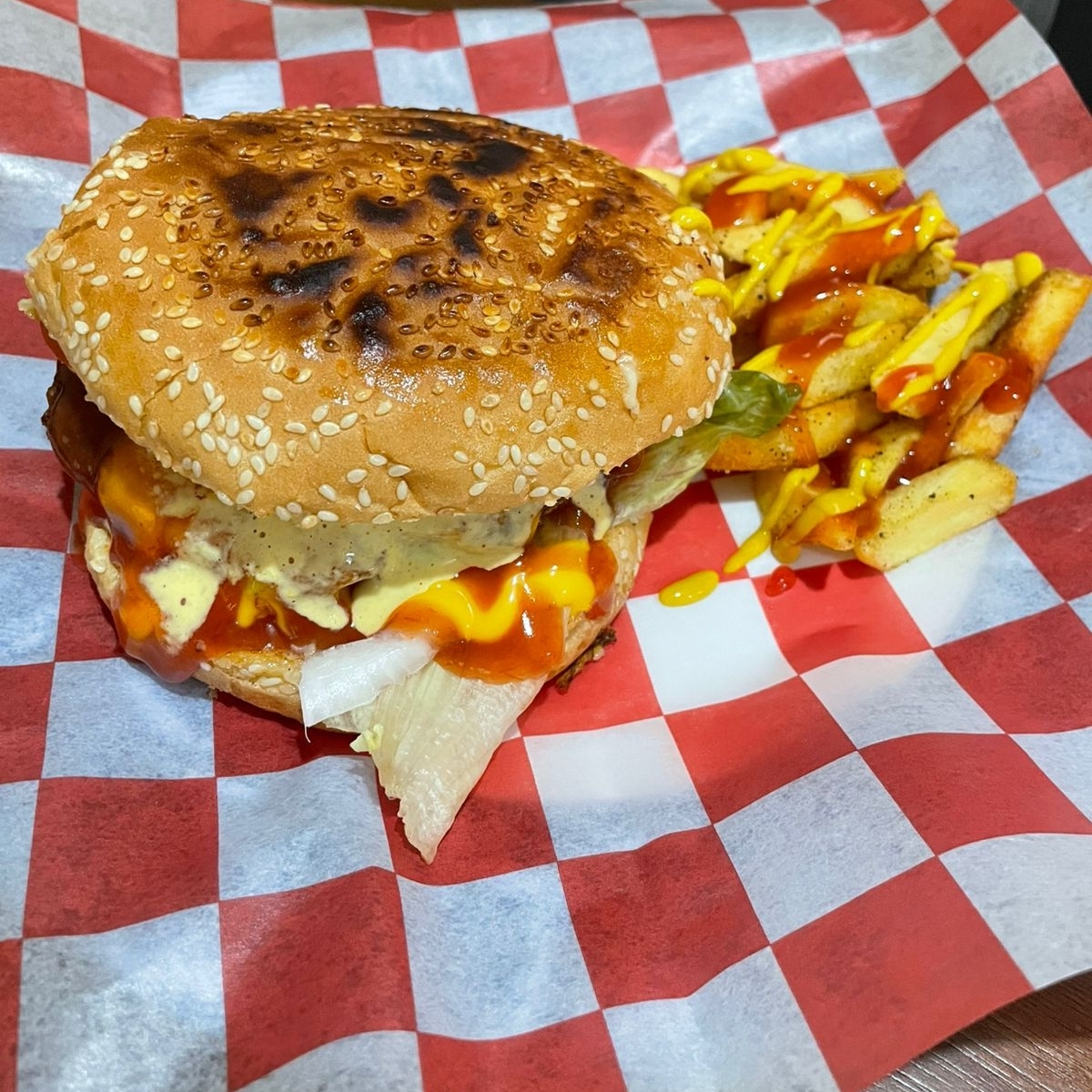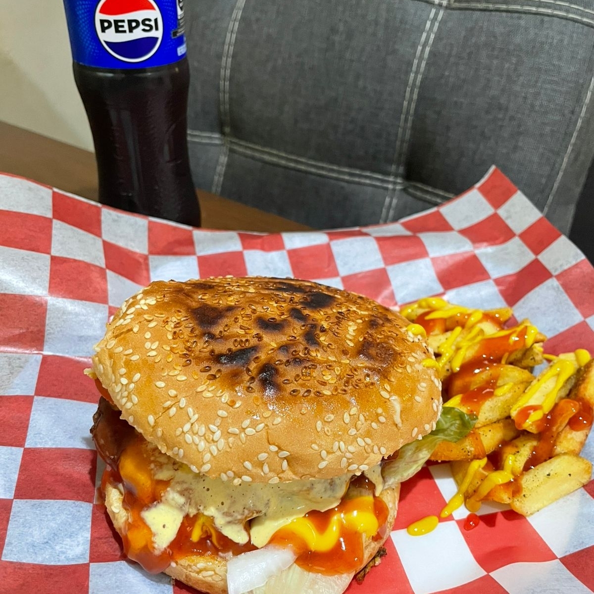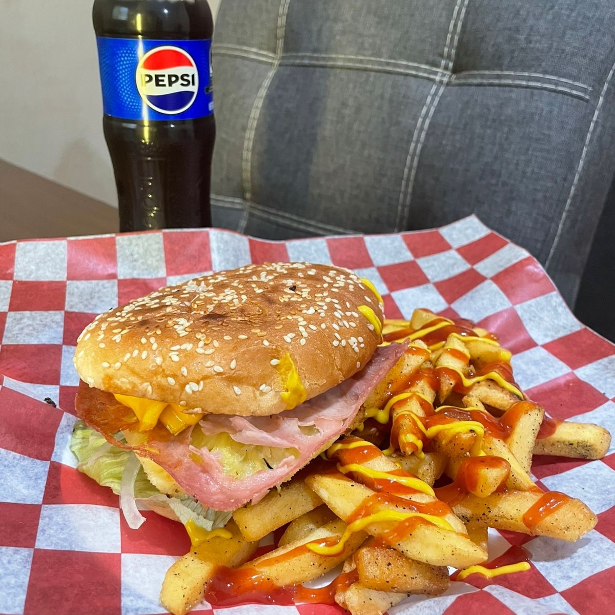 Deliciosa hamburguesa de res 100% con mayonesa jitomate, cebolla, lechuga, pepinillos, jalapeños, queso americano, catsup, mostaza, acompañada de papas a la francesa + refresco familia Pepsi 400ml.
