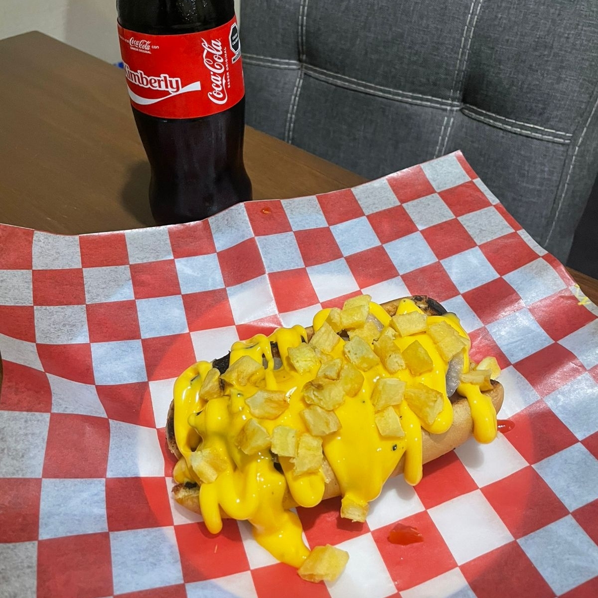 Delicioso Hot-dog preparado con mayonesa, salchicha de pavo, tocino,cebolla caramelizada, catsup, costra de queso mozzarela, bañado en queso para nachos y espolvoreado de papas fritas + CocaCola 500ml.