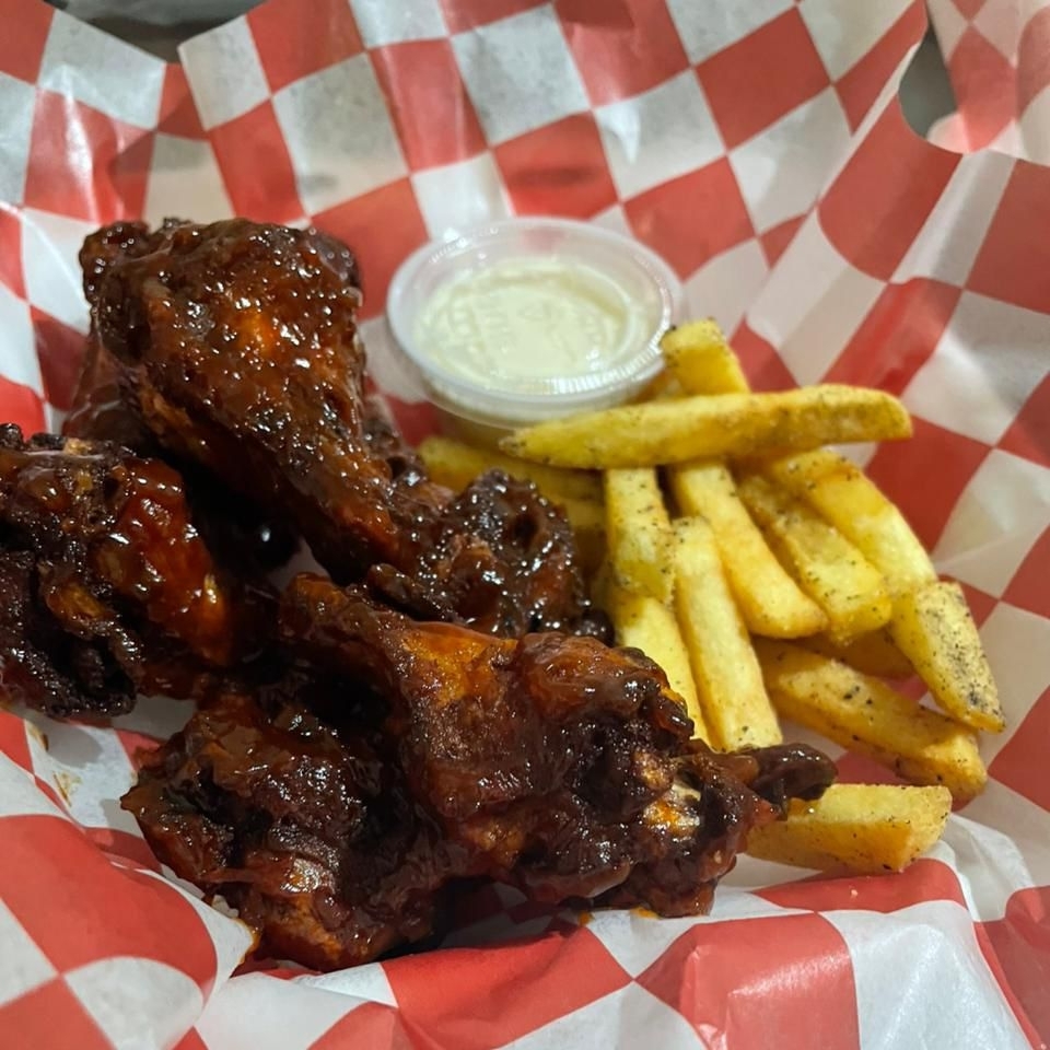 Deliciosas alitas de pollo, con la salsa a elegir entre BBQ, Búfalo y lemon peper, acompañadas de ranch y papás a la francesa.