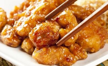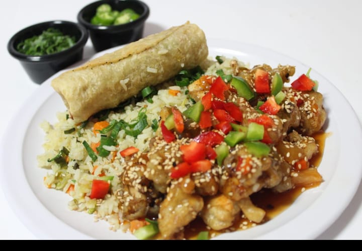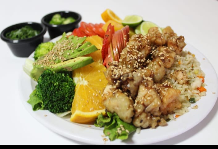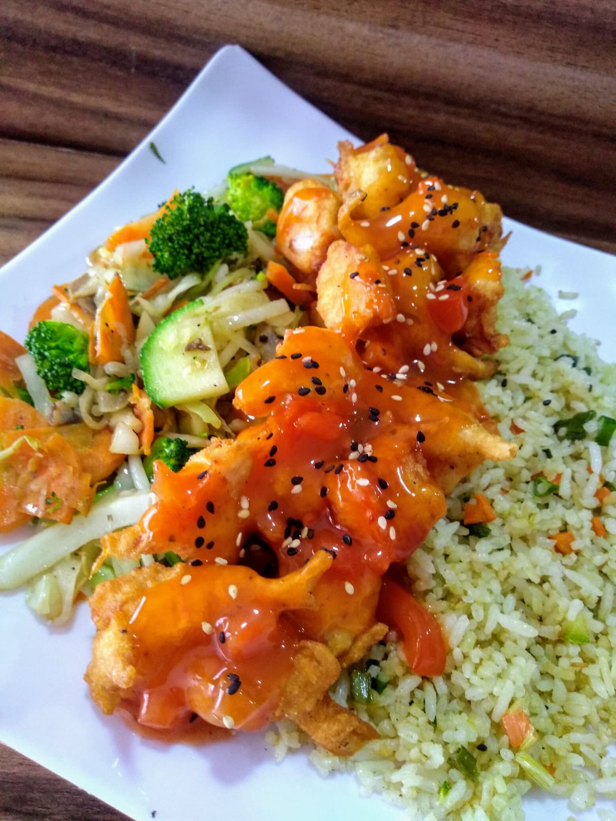 Verduras a la plancha, arroz frito y pollo capeado bañado en salsa dulce.