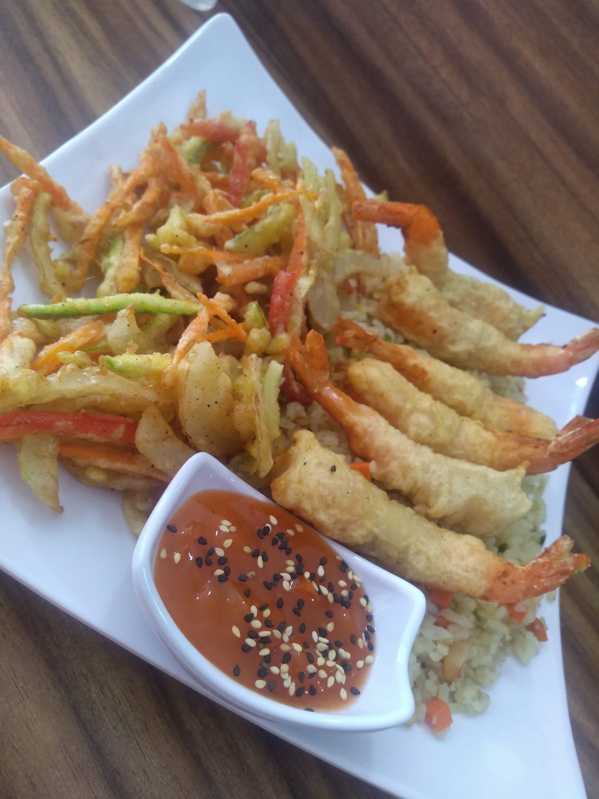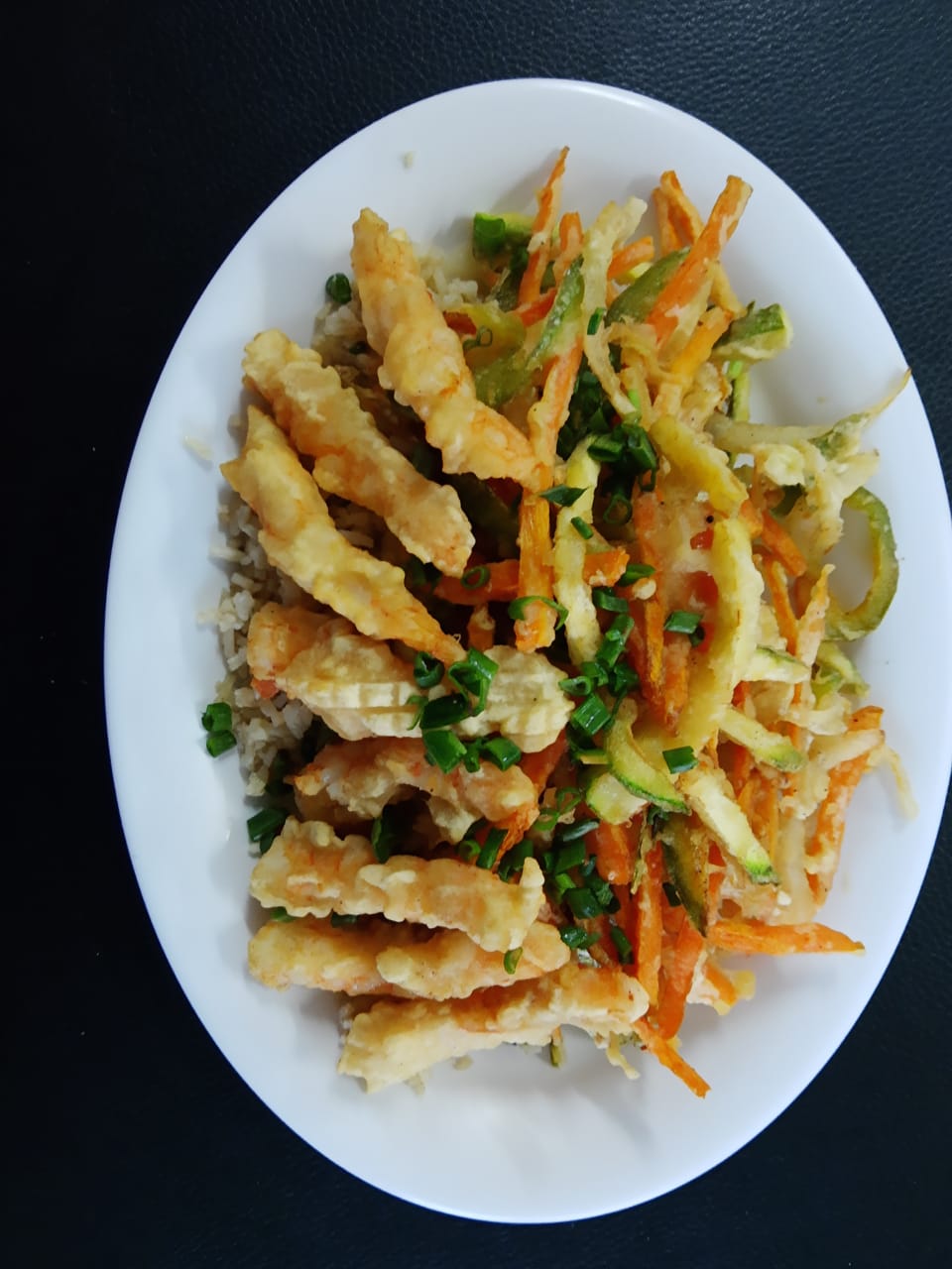 Verduras cortadas a la juliana capeada,arroz frito y pescado capeado