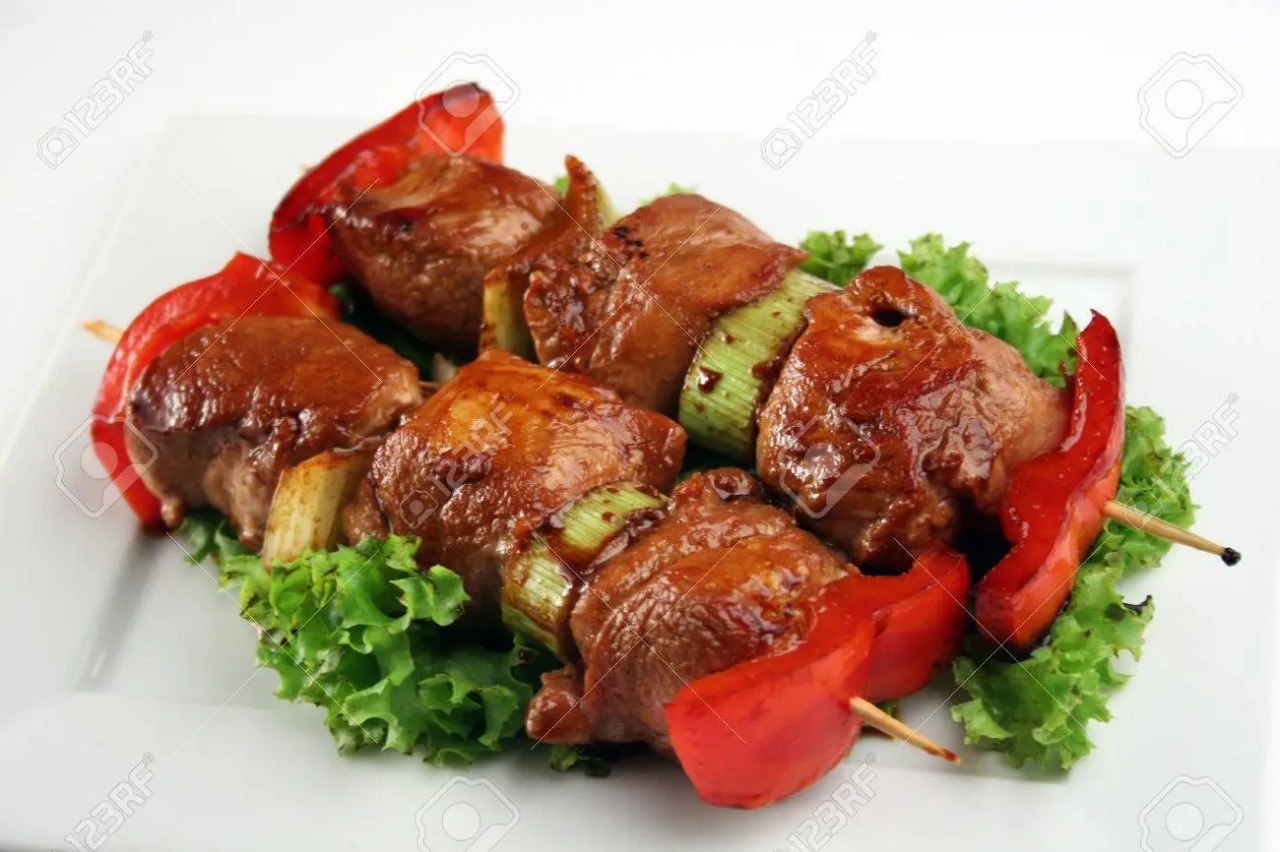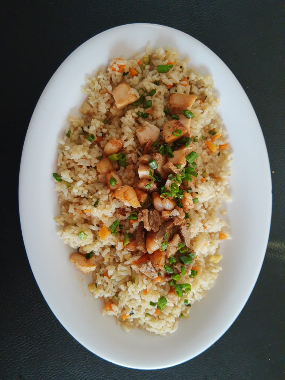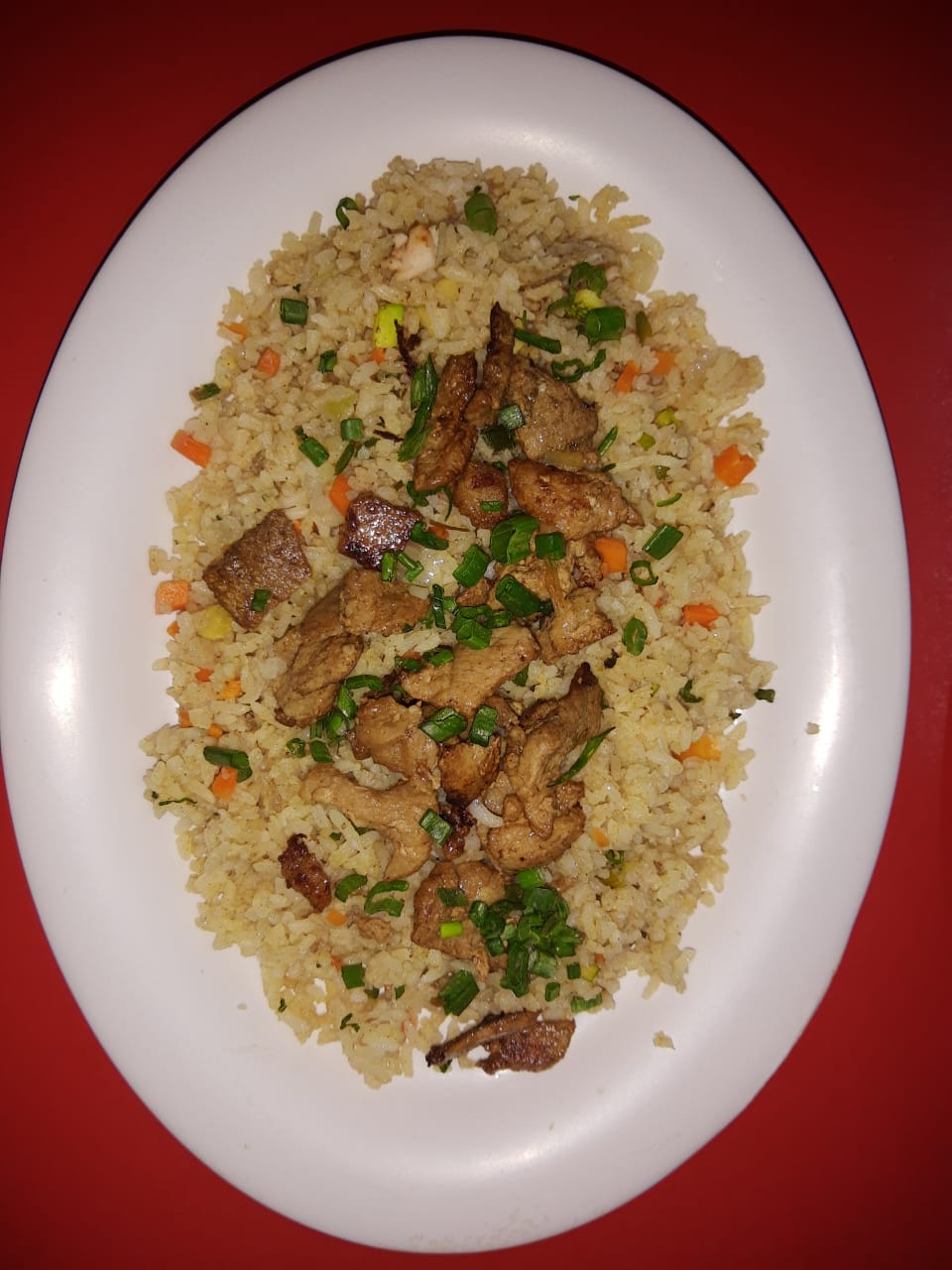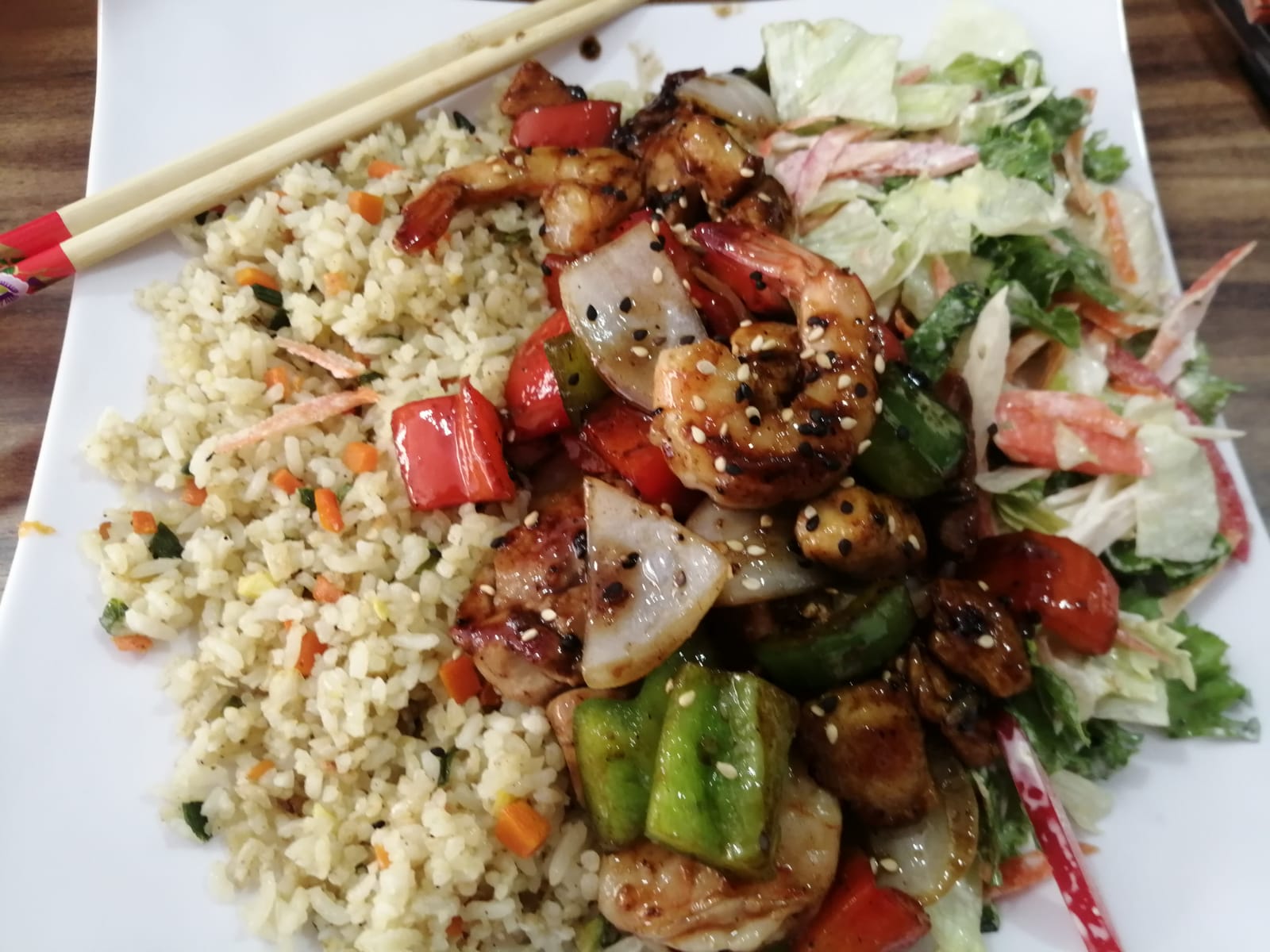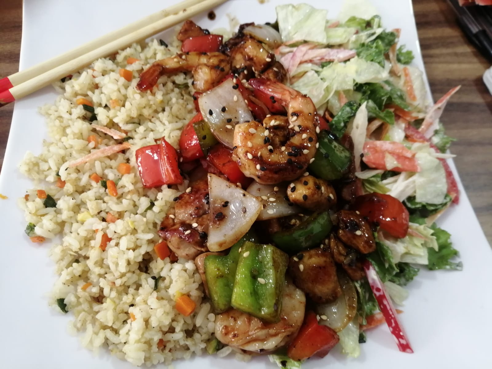 Morron verde, morron rojo,cebolla, pollo a la plancha con salsa de anguila y acompañado con ensalada kany y arroz frito