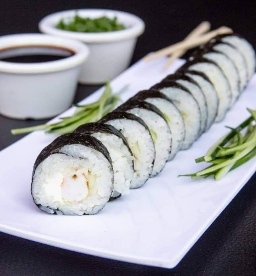 Sushi envuelto de alga marina por fuera y por dentro filadelfia,pepino,aguacate y la proteina a elegir.