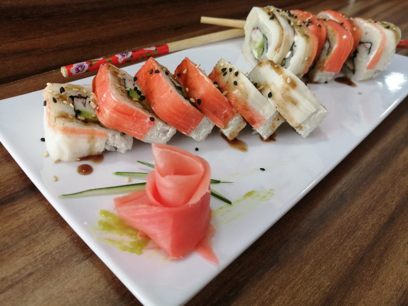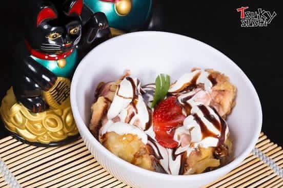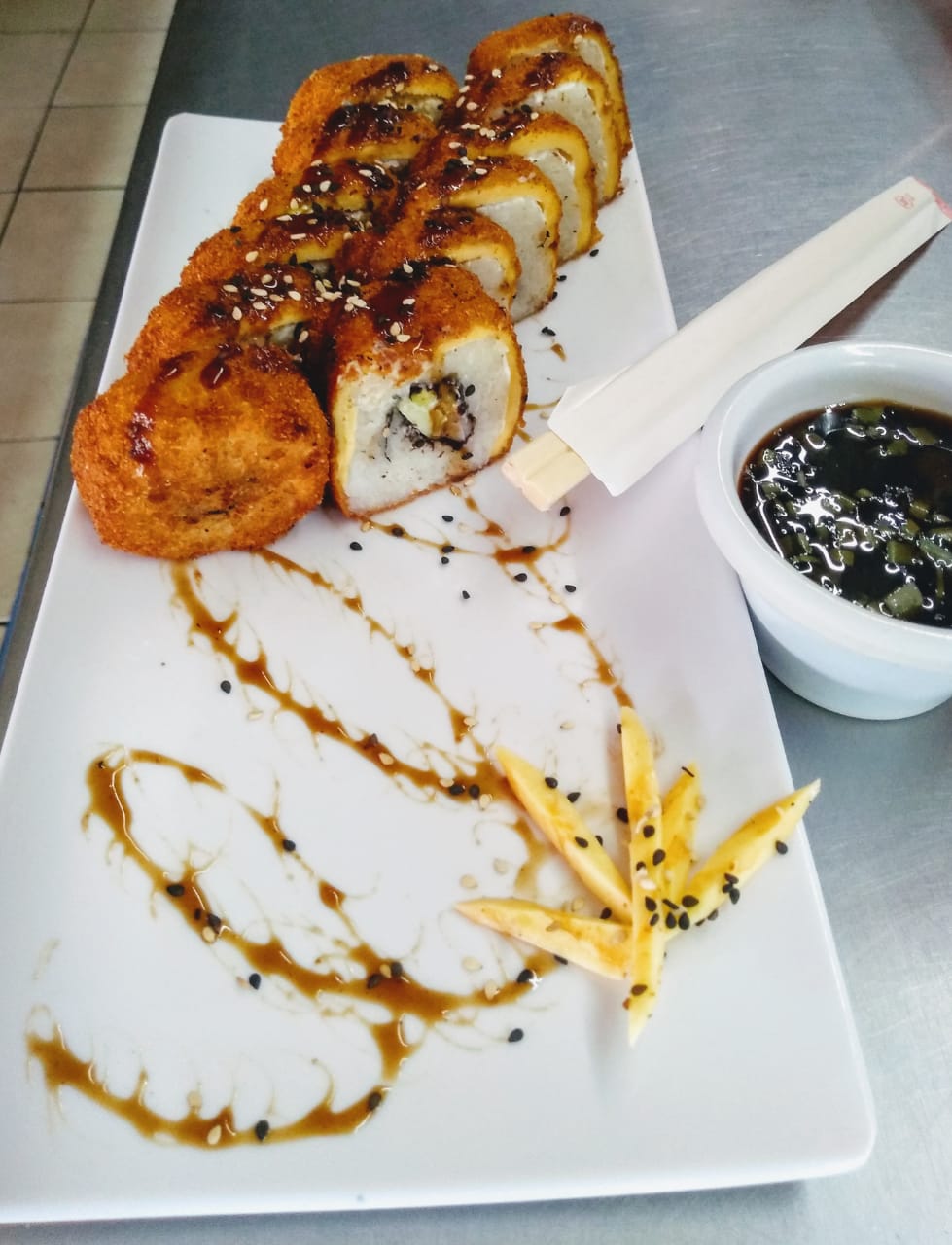 Sushi de banana por fuera y empanizado por dentro filadelfia,pepino,aguacate y la proteina a elegir