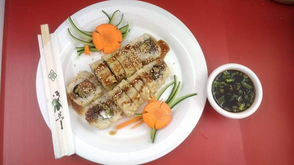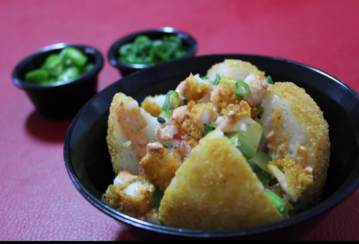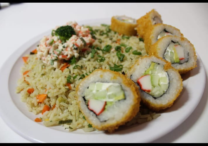 1/2 sushi empanizado, arroz frito y ensalada tampico. Los sushis incluidos en los paquetes son con surimi.