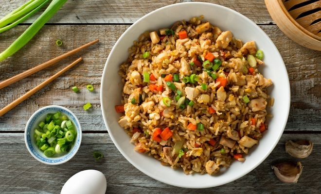 Verdura a la plancha ,arroz frito y 130g pollo a la plancha