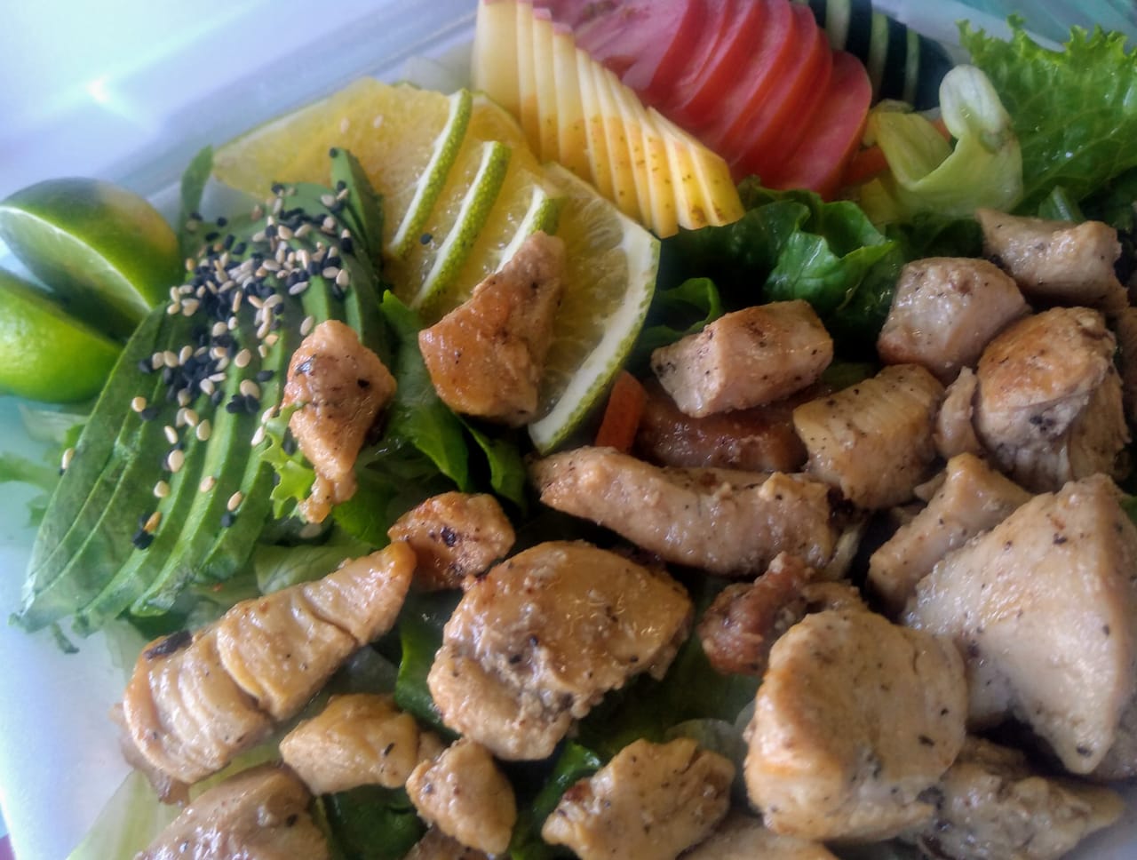 Ensalada fresca, arroz blanco y pollo a la plancha.