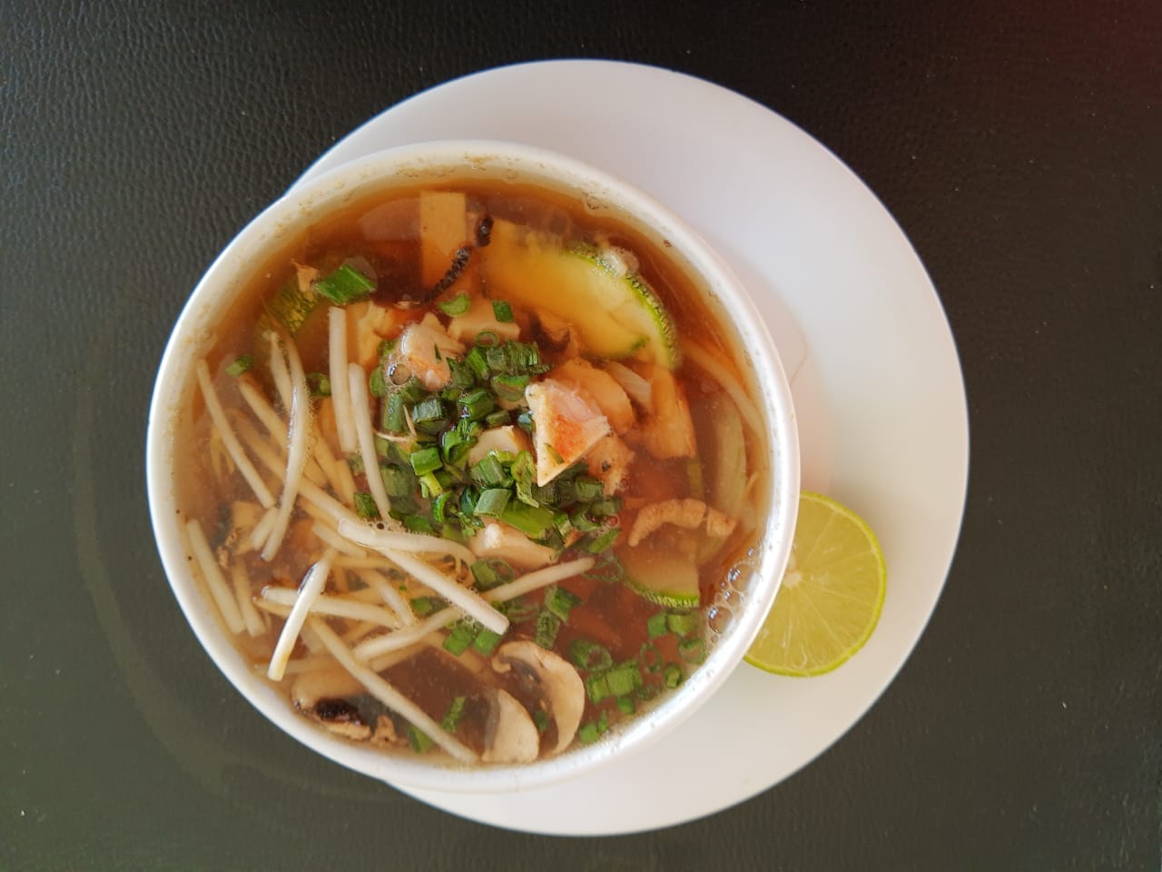Caldo de pollo con germinado,aguacate , champiñon y trozos de pollo