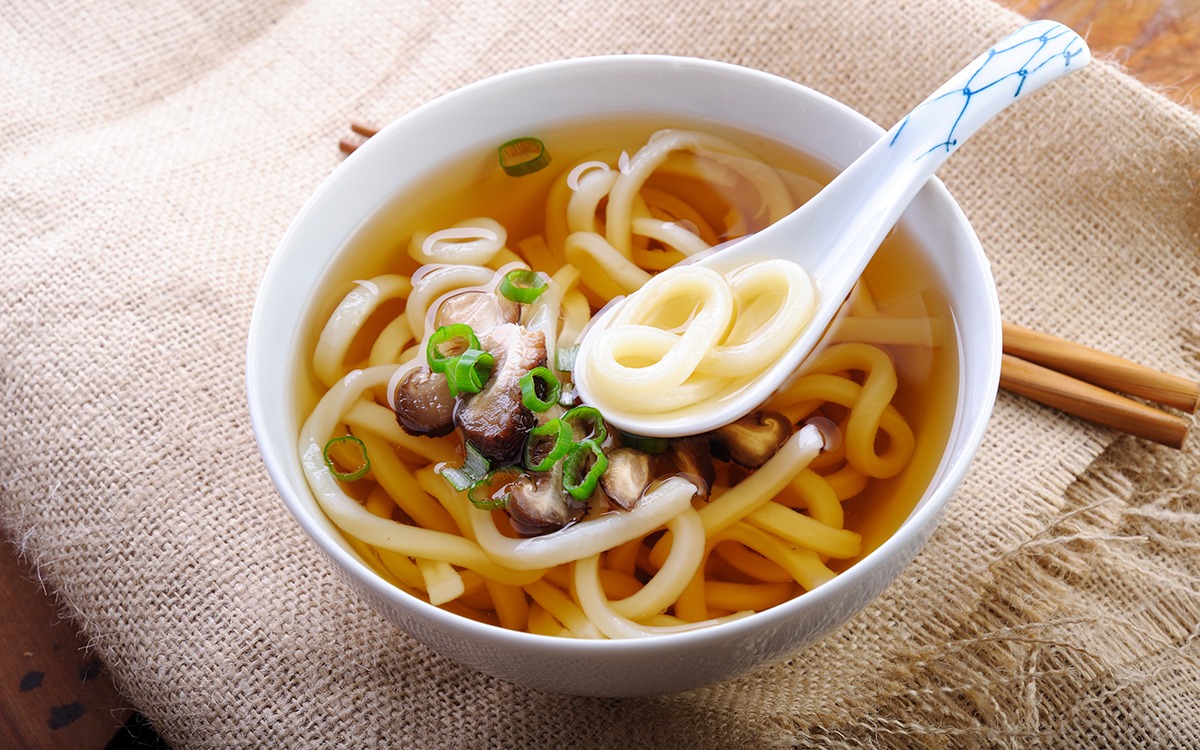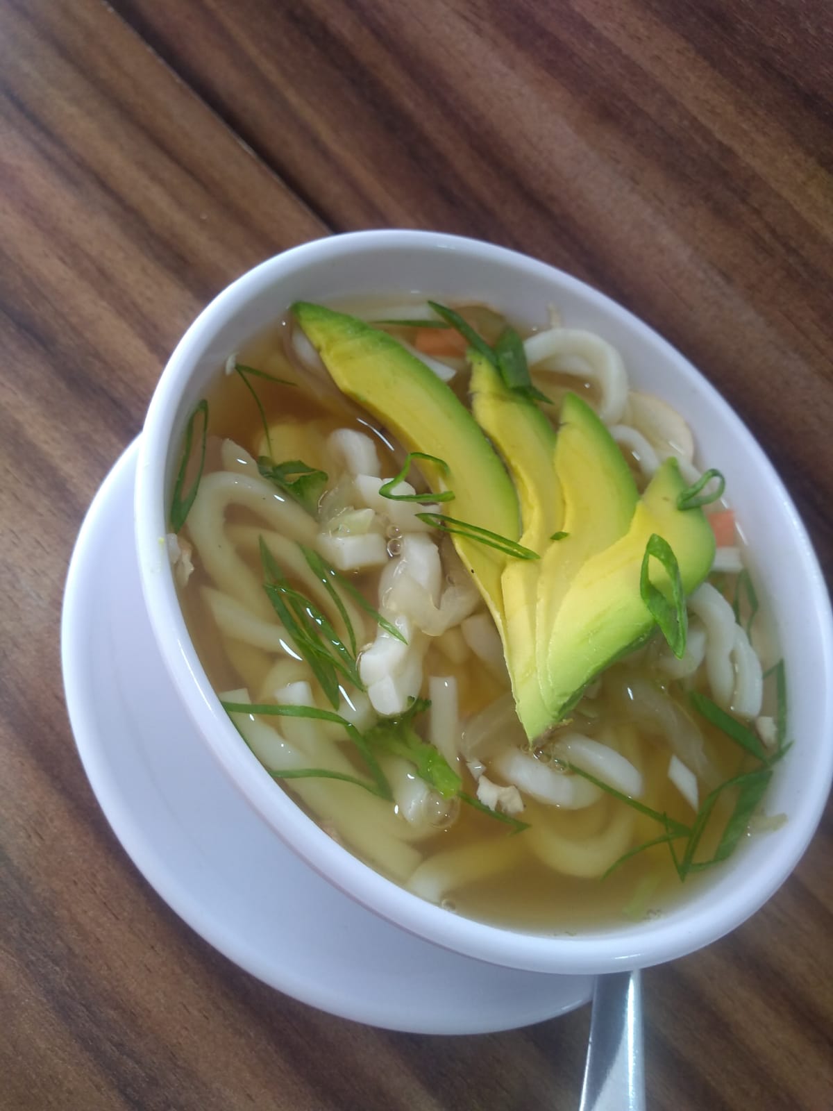 Pasta udon, camarones y surimi, arroz banco, champiñón y aguacate