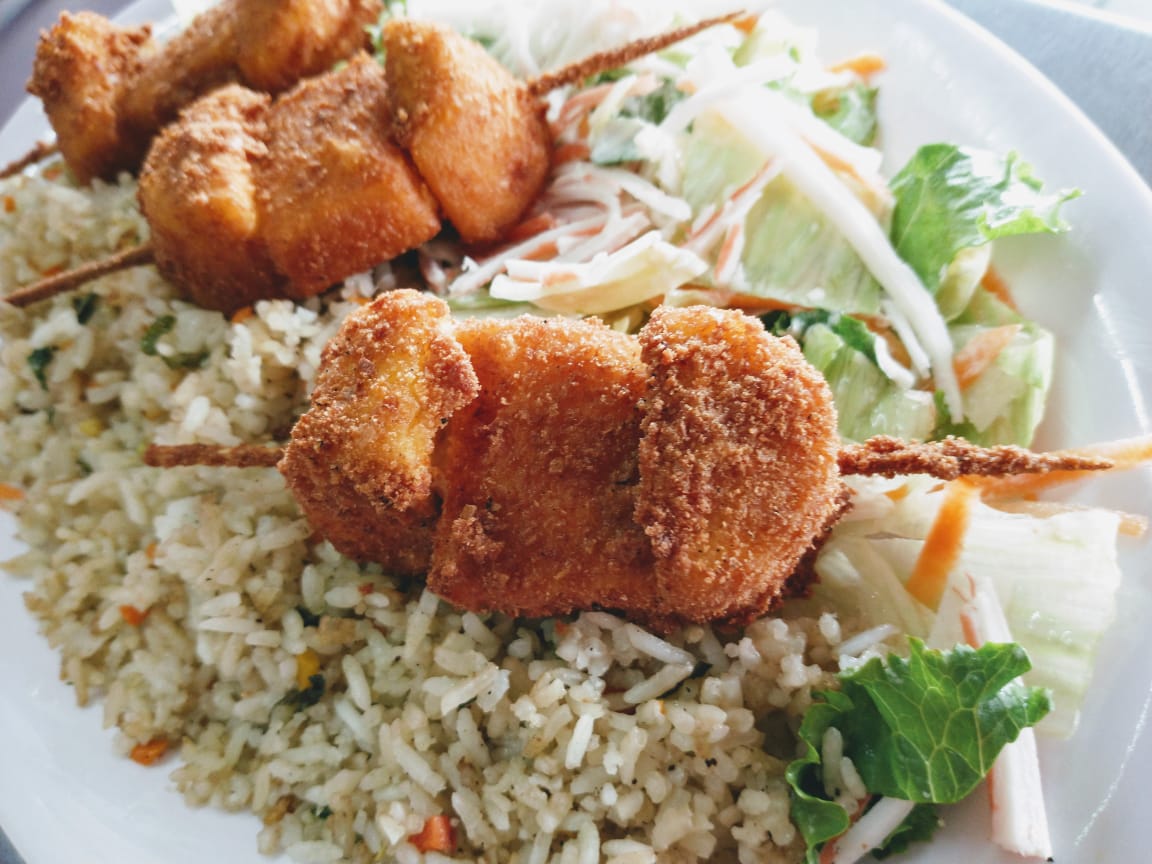 3 brochetas empanizadas acompañadas con arroz frito y ensalada kany
