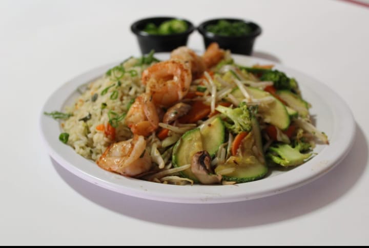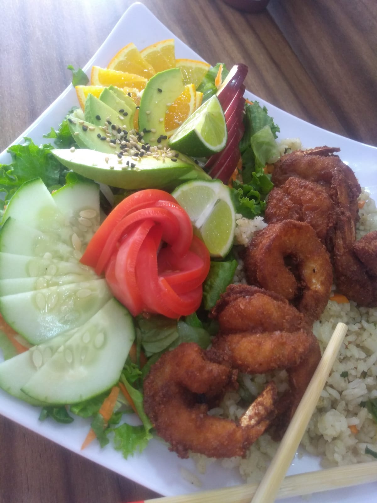 Verduras a la Juliana con arroz y camarón sazonado con salsa de anguila