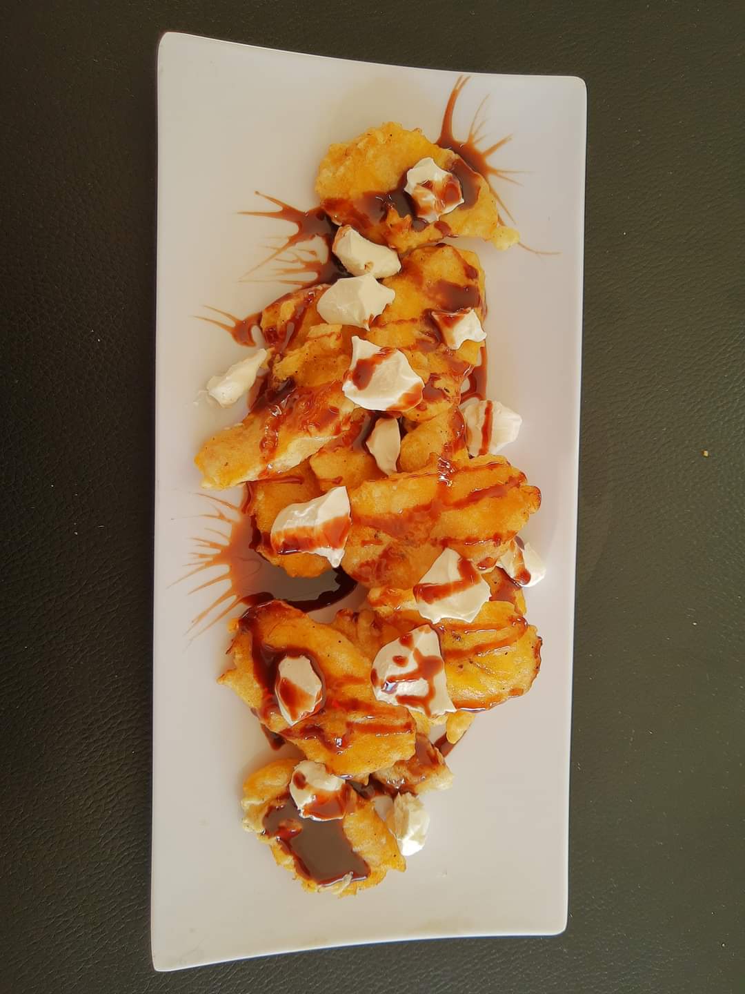 3 brochetas de platano macho con queso manchego acompañadas con arroz frito y ensalada kany