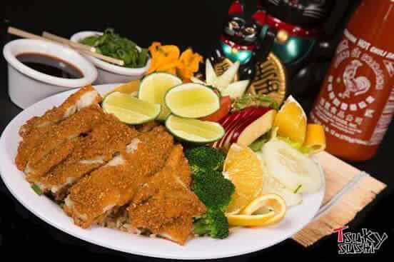 Pollo Dacyori, arroz frito y ensalada fresca. Los sushis incluidos en los paquetes son con surimi.