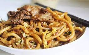 Morron rojo,morron verde,cebolla y res a la plancha con salsa de anguila acompañado con ensalada kany y arroz frito